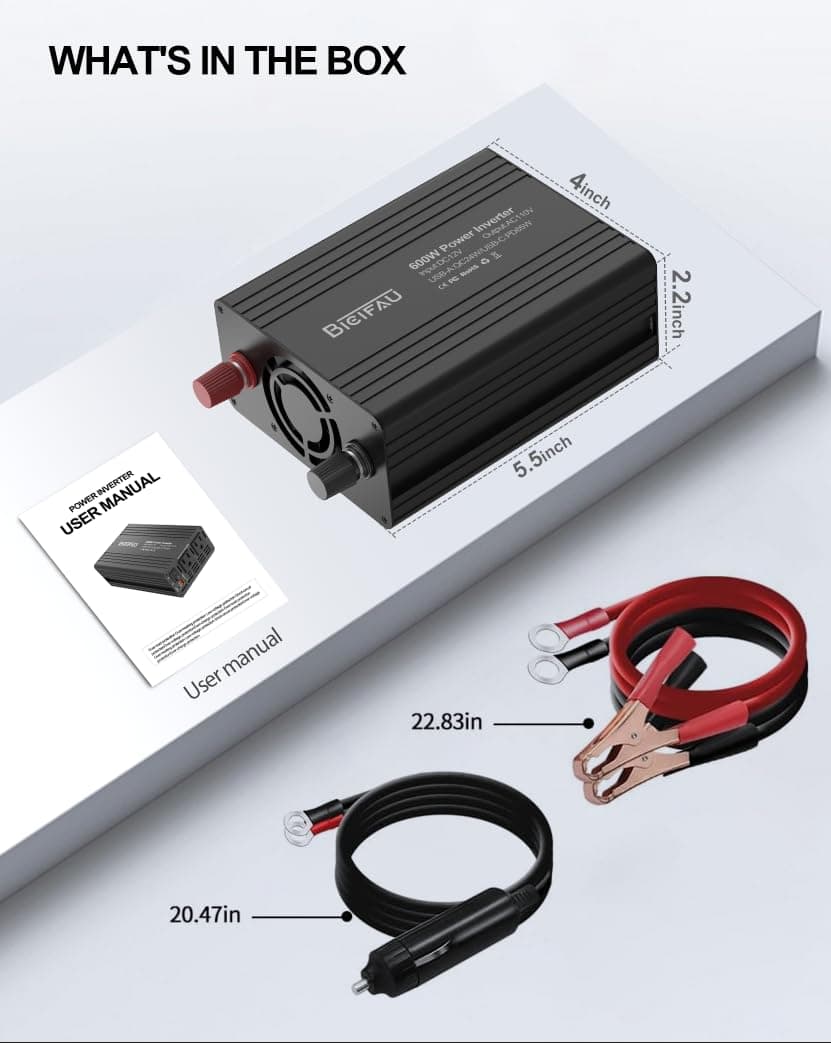 5. Más pequeño que una caja de almuerzo y pesando solo 19oz, el inversor BieiFAU de 600 vatios es más compacto que un competidor voluminoso con un diseño de 6.5 x 4 x 2.17 pulgadas que se desliza sin esfuerzo en guanteras, mochilas o armarios de caravanas. Su diseño que ahorra espacio supera a competidores voluminosos, convirtiéndolo en el inversor de corriente para coche de viaje ideal para viajes por carretera, tailgating o desplazamientos diarios. ¡Mantente alimentado sin sacrificar el valioso espacio de tu coche o equipaje!