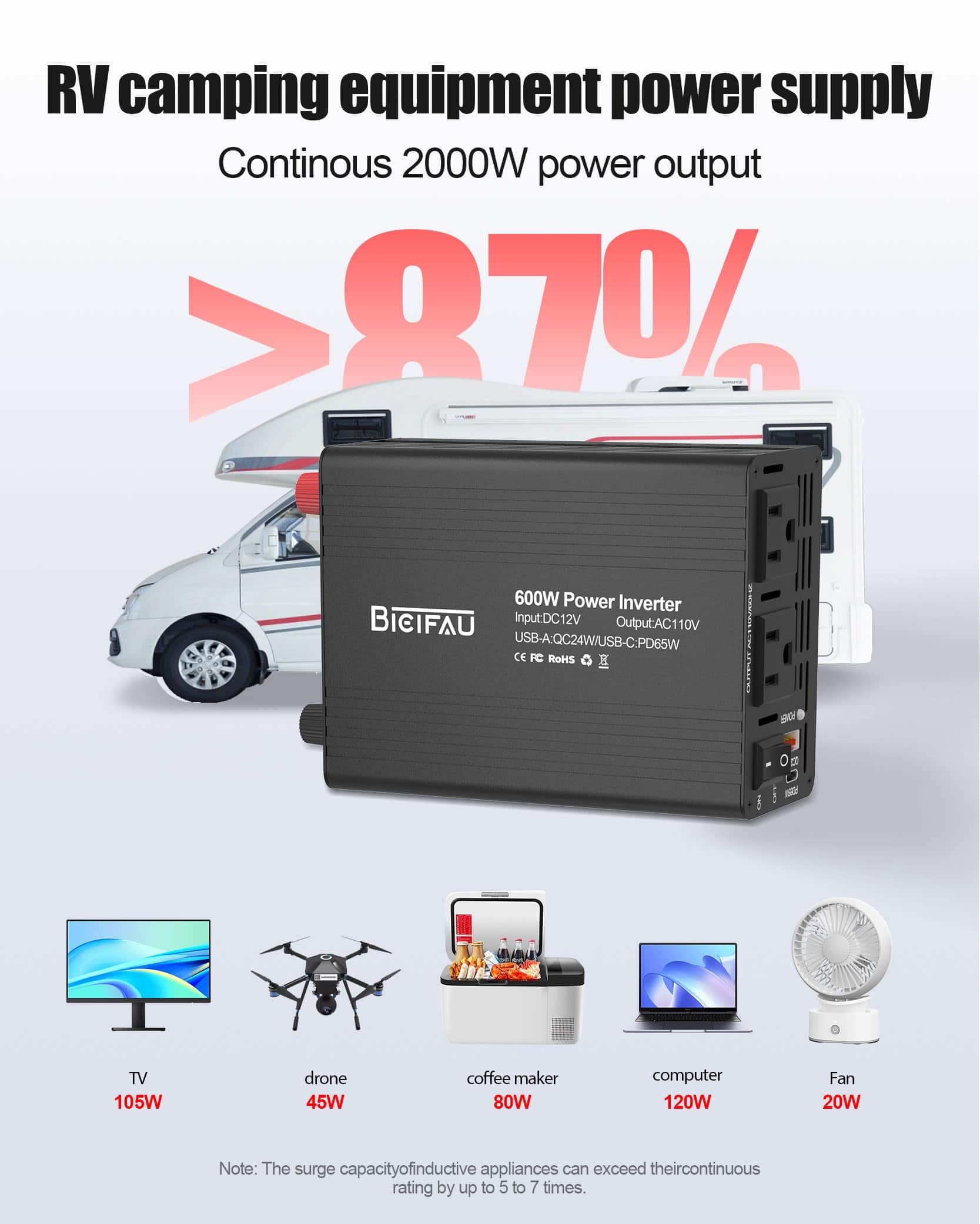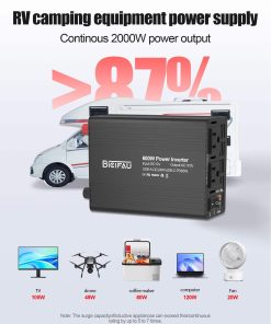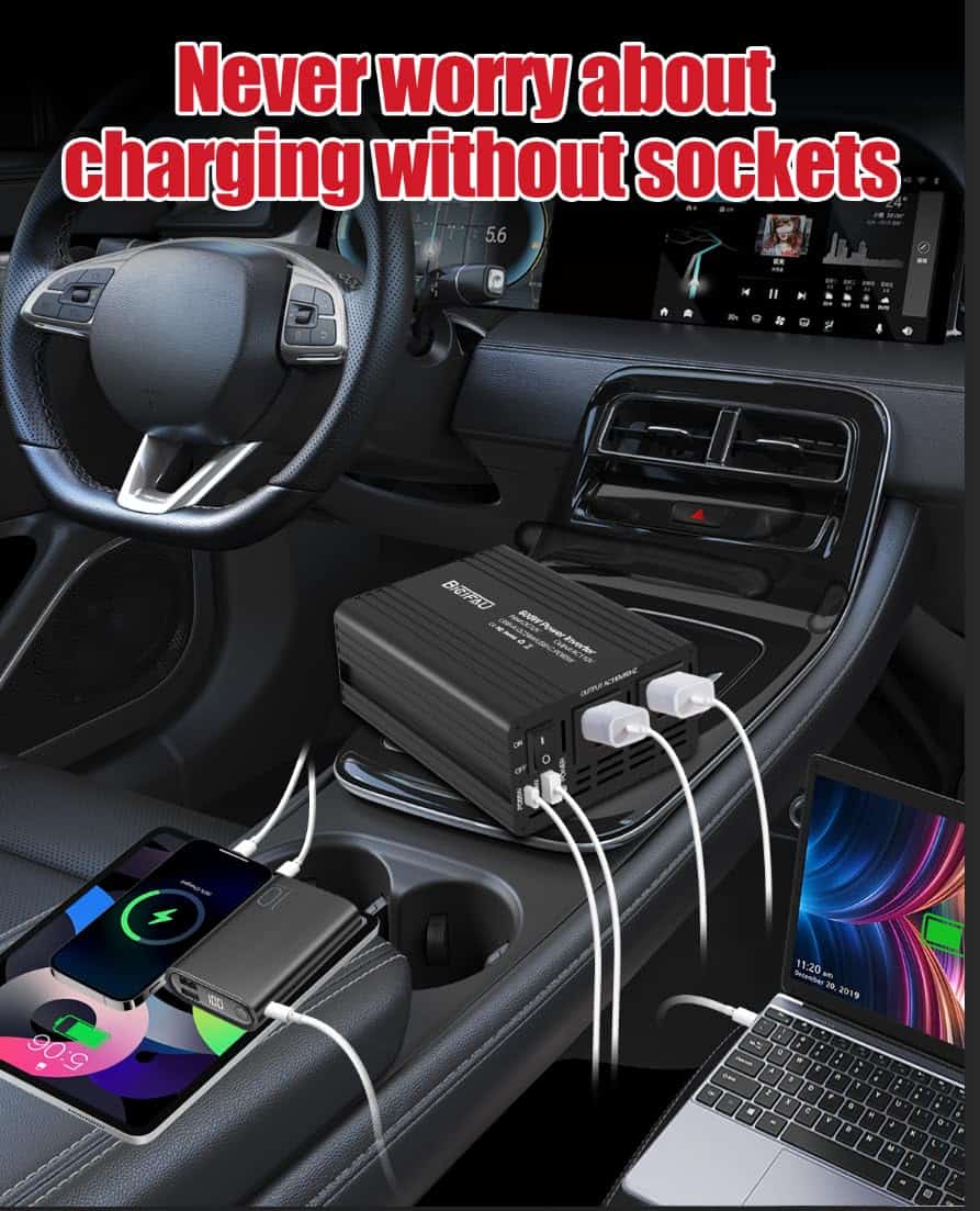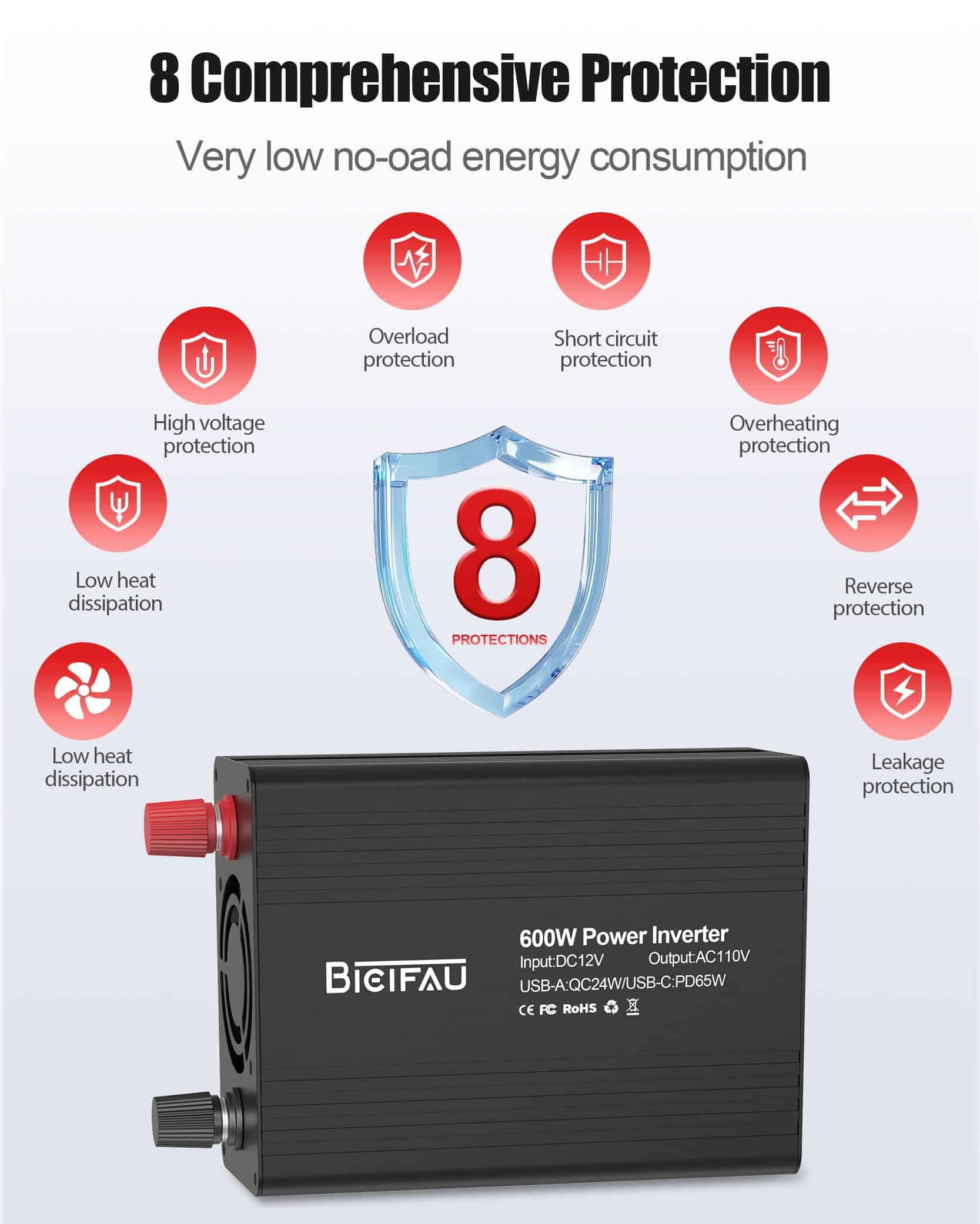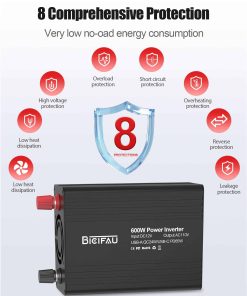 4. Construido con tecnología de seguridad inteligente, este inversor de corriente para coche BieiFAU protege contra sobretensiones, cortocircuitos, sobrecargas y picos de voltaje. Su sistema de protección múltiple (protección contra sobrecargas, cortocircuitos, sobrecalentamientos y bajo voltaje) mantiene seguro tu teléfono, portátil, máquina CPAP y fusible del coche. Este inversor de corriente tiene una luz de advertencia LED roja que te alerta al instante sobre problemas para que puedas alimentar tus dispositivos sin preocupaciones, ¡incluso a una salida máxima de 600W!.