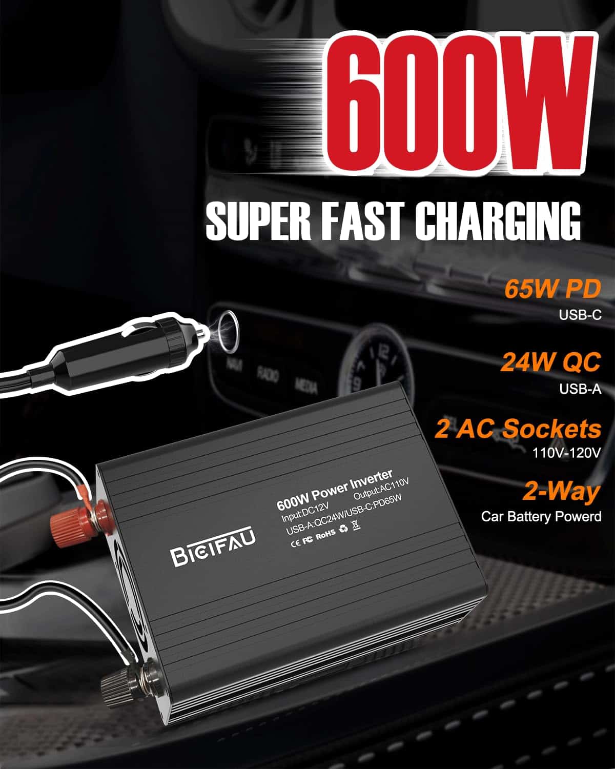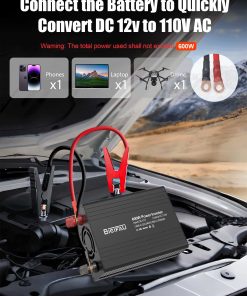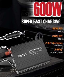 1. ¡Alimenta tu vida sobre la marcha con el inversor de corriente para coche de 600W BieiFAU, tu convertidor definitivo de 12V CC a 110V CA para emergencias en el hogar, camping en caravana, aventuras al aire libre o espacios de trabajo móviles! Con dos salidas de CA de 110V (pico de 600W), este inversor de corriente para coche de alta resistencia proporciona energía continua y estable para dispositivos de hasta 600W, incluyendo máquinas CPAP, mini-neveras, portátiles y herramientas. ¡Nunca más te preocupes por apagones o limitaciones en los viajes por carretera!.