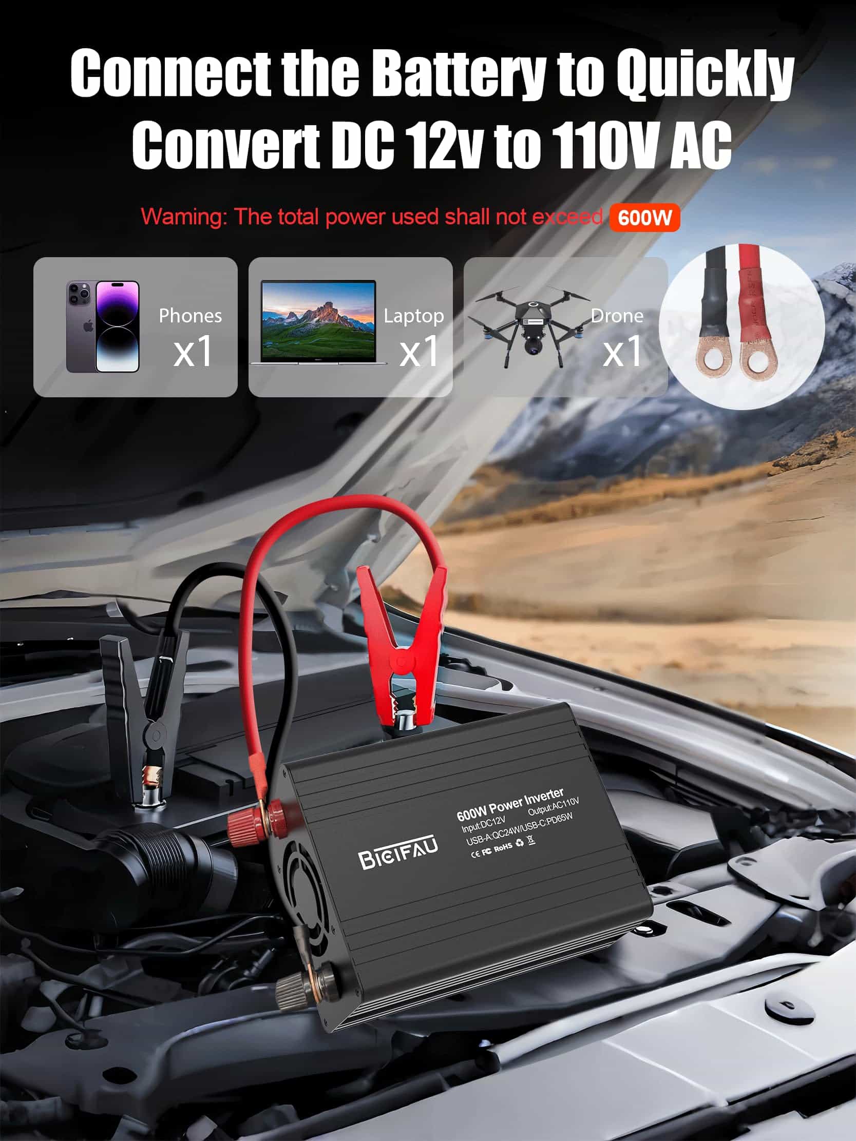 2. ¡Cambia entre modos de energía dual para adaptarse a tus necesidades! El inversor de corriente de 12v a 110v utiliza el enchufe del encendedor de cigarrillos del coche para cargar rápidamente elementos de baja potencia como portátiles, drones, cámaras o teléfonos (hasta 150W). ¿Necesitas más potencia? Conecta las pinzas de cocodrilo de alta resistencia directamente a tu batería de coche para una salida de alta potencia de 600W, un inversor BieiFAU para vehículos perfecto para bombas de aire, mini batidoras o herramientas. ¡Versátil, sin esfuerzo y listo para cualquier aventura!.