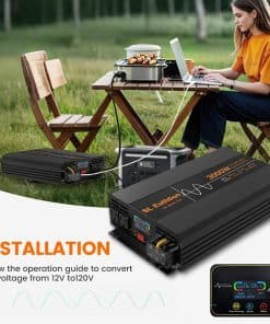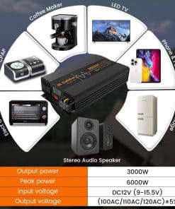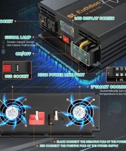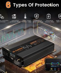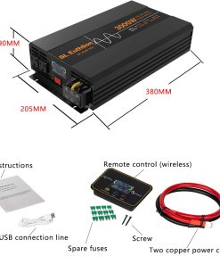 Inversor de corriente de coche de onda sinusoidal pura SL Euthtion 3000W/6000W (Pico) 12V DC a 120V AC 60HZ con pantalla LCD, puerto USB, control remoto inalámbrico (10M) para coche en casa portátil camión. Este inversor convierte la corriente de 12V DC de la batería en 110V AC, proporcionando una potencia estable de 3000W y una potencia máxima de 6000W. Incluye un control remoto inalámbrico para un manejo conveniente. Cuenta con 6 protecciones de seguridad integrales, incluyendo protección contra sobretensión, protección contra sobrecarga, protección contra sobretemperatura, protección contra cortocircuitos, protección contra inversión de polaridad y un sistema de enfriamiento por ventilador para un uso seguro. Fácil de instalar y utilizar, este inversor es ideal para usar electrodomésticos y dispositivos electrónicos con tranquilidad. Incluye garantía de 12 meses y soporte técnico. ¡Obtén el mejor rendimiento cargando previamente el control remoto!