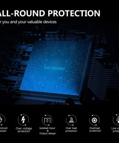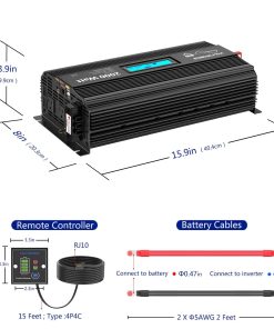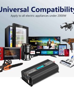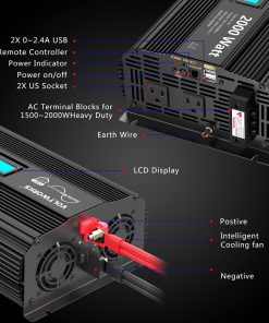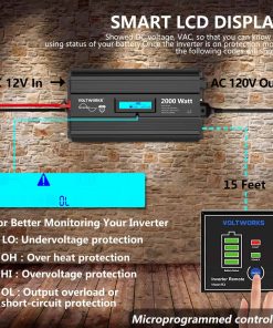 VOLTWORKS se dedica a resolver tus problemas de energía al aire libre y de emergencia con un inversor de alta calidad. Es ideal para camiones, autocaravanas en viajes por carretera o en casos de cortes de energía, alimenta tus dispositivos en casa o al aire libre en caso de emergencia, huracán, tormenta o corte de energía. ESPECIFICACIONES: Potencia: 2000 vatios de potencia nominal, 4000 vatios de potencia máxima. Onda salida: Onda sinusoidal modificada. Voltaje de entrada: 9.5-16VDC. Voltaje de salida: 120VAC +/- 10%. Eficiencia: hasta un 90%. Pantalla LCD: Muestra la capacidad restante de la batería y el voltaje de entrada/salida del inversor. Control remoto con cable de 15 pies. Ventilador de enfriamiento inteligente incorporado: Funcionará automáticamente cuando la temperatura alcance los 104 grados Fahrenheit o la potencia de carga sea mayor al 40% de la potencia nominal. Protección contra sobrecalentamiento: Alrededor de 149 grados Fahrenheit. Apagado por sobre voltaje: 16V +/- 0.5VDC. Alarma de subtensión: 9.8V +/- 0.5VDC. Apagado por subtensión: 9.5V +/- 0.5VDC. ATENCIÓN: Conecte el inversor a una batería de 12V con los cables estándar provistos con el producto y enchufe sus dispositivos AC en el inversor. No deje el inversor encendido cuando el automóvil esté apagado. Desconecte el terminal positivo de la batería antes de hacer cualquier cableado al inversor. No exponga el inversor directamente a la luz solar, manténgalo en un ambiente fresco y seco. No use el inversor con un producto que consuma más vatios de los que el inversor puede proporcionar, ya que esto podría causar daños al inversor y al producto. LISTA DE PAQUETES: 1x Inversor de energía de 2000 vatios, 2x Cables de batería (negro y rojo), 1x Control remoto, 1x Manual de usuario.