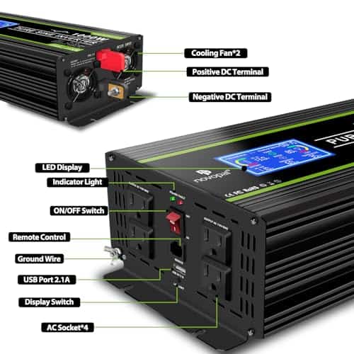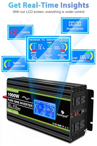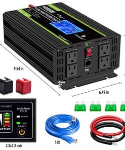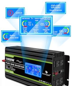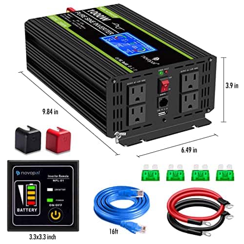 1. Novopal Inversores de Onda Sinusoidal Pura Marca famosa de inversores de corriente. Convierte 12V DC a AC 110V/120V de corriente de la pared del hogar con una potencia continua de 1000 Watts (capacidad de sobretensión de 2000 Watts). Cuenta con 4 tomas de corriente AC, un puerto USB de 2.1A, terminales DC de alta corriente y un control remoto con cable (de 5 metros de longitud), pantalla digital LCD.