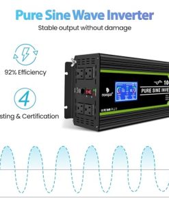 Inversor de Corriente de Onda Sinusoidal Pura Novopal 1000 Watts – Convierte 12V DC a AC 110V/120V de corriente de la pared del hogar. Cuenta con una potencia continua de 1000 Watts y una capacidad de sobretensión de 2000 Watts. Incluye 4 tomas de corriente AC, un puerto USB de 2.1A, terminales DC de alta corriente y un control remoto con cable de 5 metros de longitud. La pantalla digital LCD muestra la fuente de alimentación de la batería, voltaje de entrada de la batería, voltaje de salida de AC, carga de salida, advertencia de sobretensión, subtensión, advertencia de sobrecarga/cortocircuito, encendido/apagado de la corriente. Ideal para Televisores, Sistemas de Audio, Herramientas de Velocidad Variable, Impresoras Láser, Laptops, Emergencias, Camping y más. Cuenta con protecciones de seguridad completas como apagado por sobrecalentamiento, protección automática contra sobrecargas, protección contra sobretensión y subtensión, alarma audible de bajo voltaje, protección contra cortocircuitos, terminal de tierra AC. Incluye garantía de 12 meses. Viene en un paquete que incluye una caja de regalo, el Inversor de Onda Sinusoidal Pura DC12V a AC110V 1000W TS1000, un Manual de Usuario, un Juego de Cables de Batería (1 Rojo, 1 Negro), un Control Remoto. INVERSOR NOVOPAL, USTED MERECE ESTO. Estamos listos para ayudarte con cualquier problema que puedas encontrar durante el uso, contáctanos por correo electrónico.