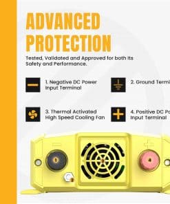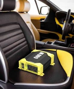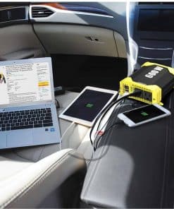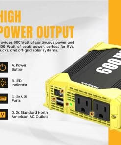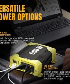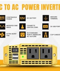 Inversor de corriente KRIEGER de 600 vatios de onda senoidal modificada, convierte 12V DC a 110V AC Power. Conecta los cables de la batería DC directamente a la batería de tu vehículo para tener energía sobre la marcha. Este inversor de corriente está diseñado para que puedas utilizar tus dispositivos electrónicos mientras estás en movimiento. Cuenta con un adaptador de encendedor de cigarrillos directo para que puedas conectar dispositivos eléctricos con este inversor que se conecta a tu encendedor de cigarrillos o se conecta directamente a una batería de coche para alimentar tus laptops, cargadores de teléfonos celulares, tablets, pequeños dispositivos electrónicos y más. Con ventilador térmico ultra silencioso y puertos de carga USB – 2 puertos de carga USB (2.4A cada uno) y doble toma de corriente alterna de 110V para cargar dispositivos más grandes de hasta 600W. Protección avanzada – Probado, Validado y Aprobado tanto por su seguridad como por su rendimiento. Aprobado por ETL bajo UL STD 458 y CSA std C22.2. Lo que obtendrás: Garantía de 3 años de piezas y mano de obra, Inversor de corriente de 600W, Cable de encendedor de cigarrillos, Cables de pinza de batería, Equipo de atención al cliente especializado y Soporte técnico de instalación por correo electrónico, chat o teléfono.