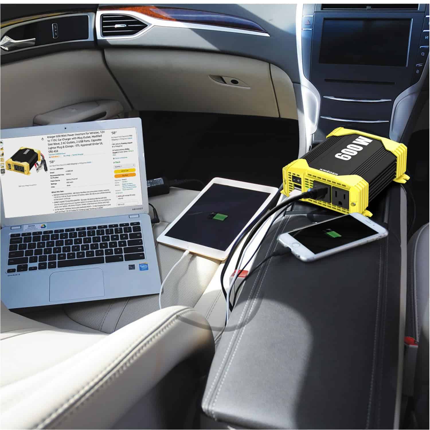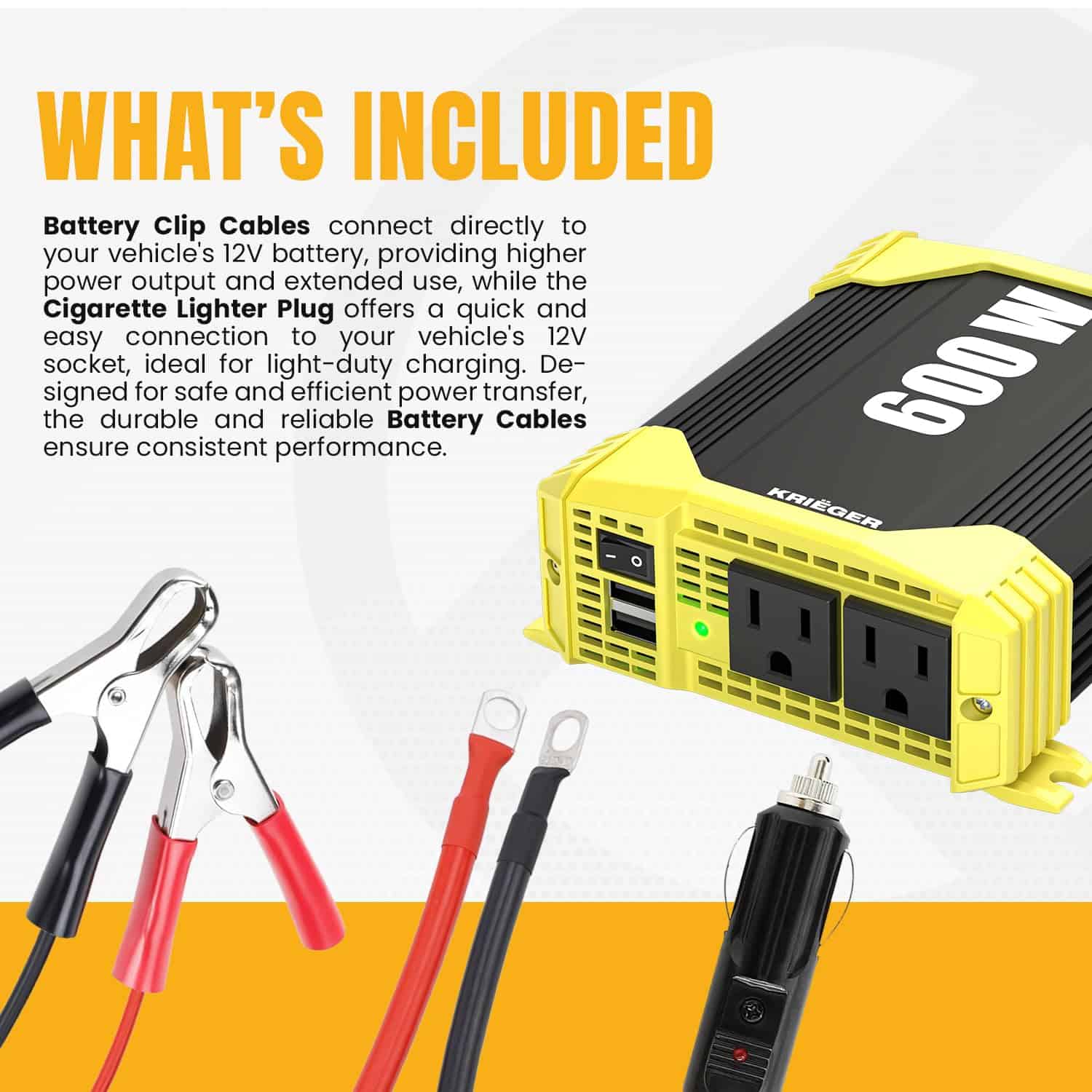 1. Inversor de corriente KRIEGER – 600 vatios inversor de corriente de onda senoidal modificada, convierte 12V DC a 110V AC Power. Conecta los cables de batería DC directamente a la batería de tu vehículo para tener energía sobre la marcha.