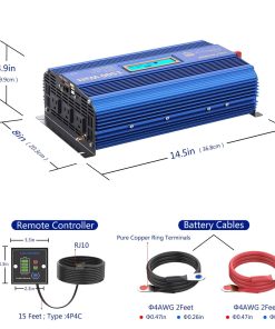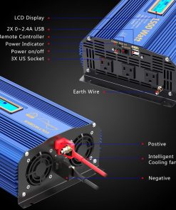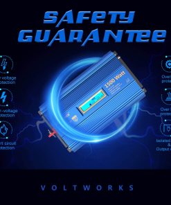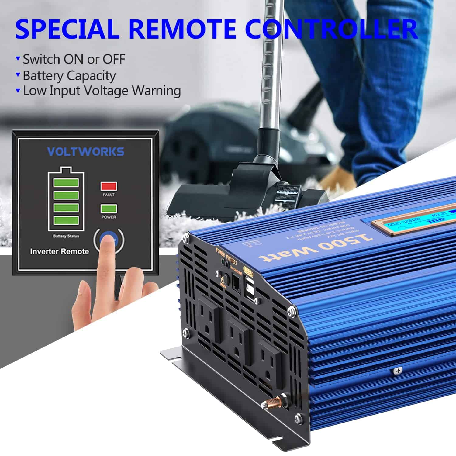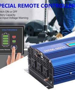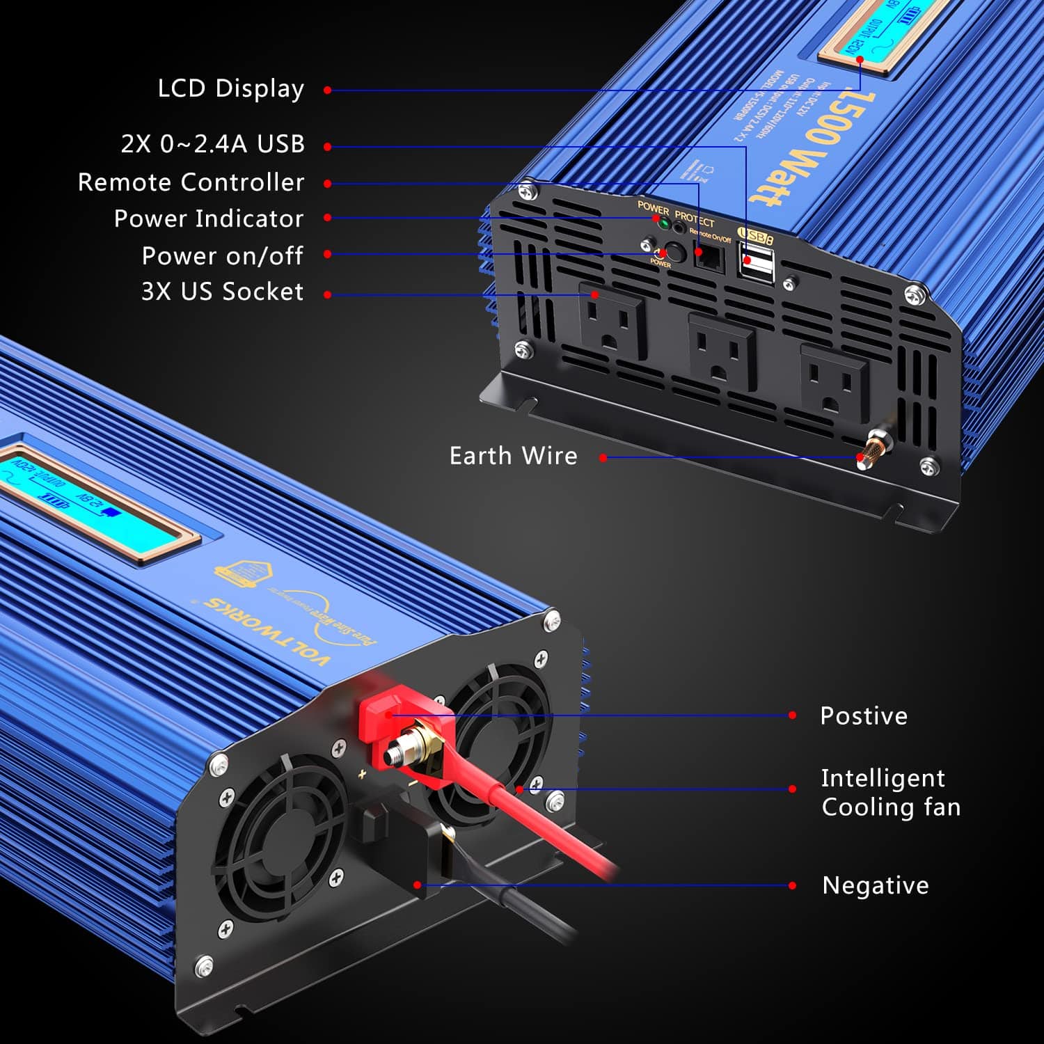 VOLTWORKS se dedica a resolver sus problemas de energía exterior y de emergencia con un inversor de alta calidad. Es ideal para camiones, vehículos recreativos en viajes por carretera o donde haya un corte de energía, para alimentar sus dispositivos en casa o al aire libre en caso de emergencia, huracán, tormenta, apagón. ESPECIFICACIONES: Potencia: 1500 vatios de potencia nominal, 3000 vatios de potencia máxima. Onda de salida: Onda sinusoidal pura. Tensión de entrada: 9.5-16VCC. Tensión de salida: 120VCA ± 10%. Eficiencia: hasta 90%. Pantalla LCD: muestra la capacidad restante de su batería, la tensión de entrada/salida del inversor y algunos códigos de protección cuando el inversor está en modo de protección. Control remoto con cables de 15 pies. Ventilador de refrigeración inteligente incorporado: funcionará automáticamente cuando la temperatura alcance los 104 ºC o la potencia de carga sea superior al 40% de la potencia nominal. Protección contra sobrecalentamiento: alrededor de 149 ºC. Apagado por sobretensión: 16V ± 0.5VCC. Alarma de subtensión: 9.8V ± 0.5VCC. Apagado por subtensión: 9.5V ± 0.5VCC. ATENCIÓN: Conecte el inversor a una batería de 12V con los cables estándar suministrados con el producto y enchufe sus dispositivos de CA en el inversor. No deje el inversor en la posición ON cuando su automóvil esté apagado. Desconecte el terminal de batería positivo antes de hacer cualquier cableado al inversor. No coloque el inversor directamente al sol, manténgalo en un ambiente fresco y seco. No use el inversor con un producto que consuma más potencia de la que el inversor puede proporcionar, ya que esto puede dañar el inversor y el producto. LISTA DE PAQUETE: 1 inversor de 1500 vatios. 2 cables de batería (negro y rojo). 1 controlador remoto. 1 manual de usuario. GARANTÍA: 18 meses por VOLTWORKS.