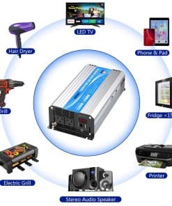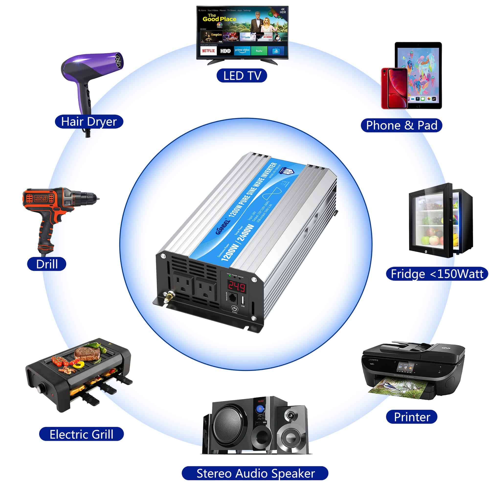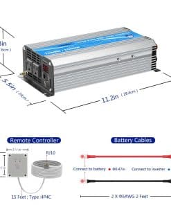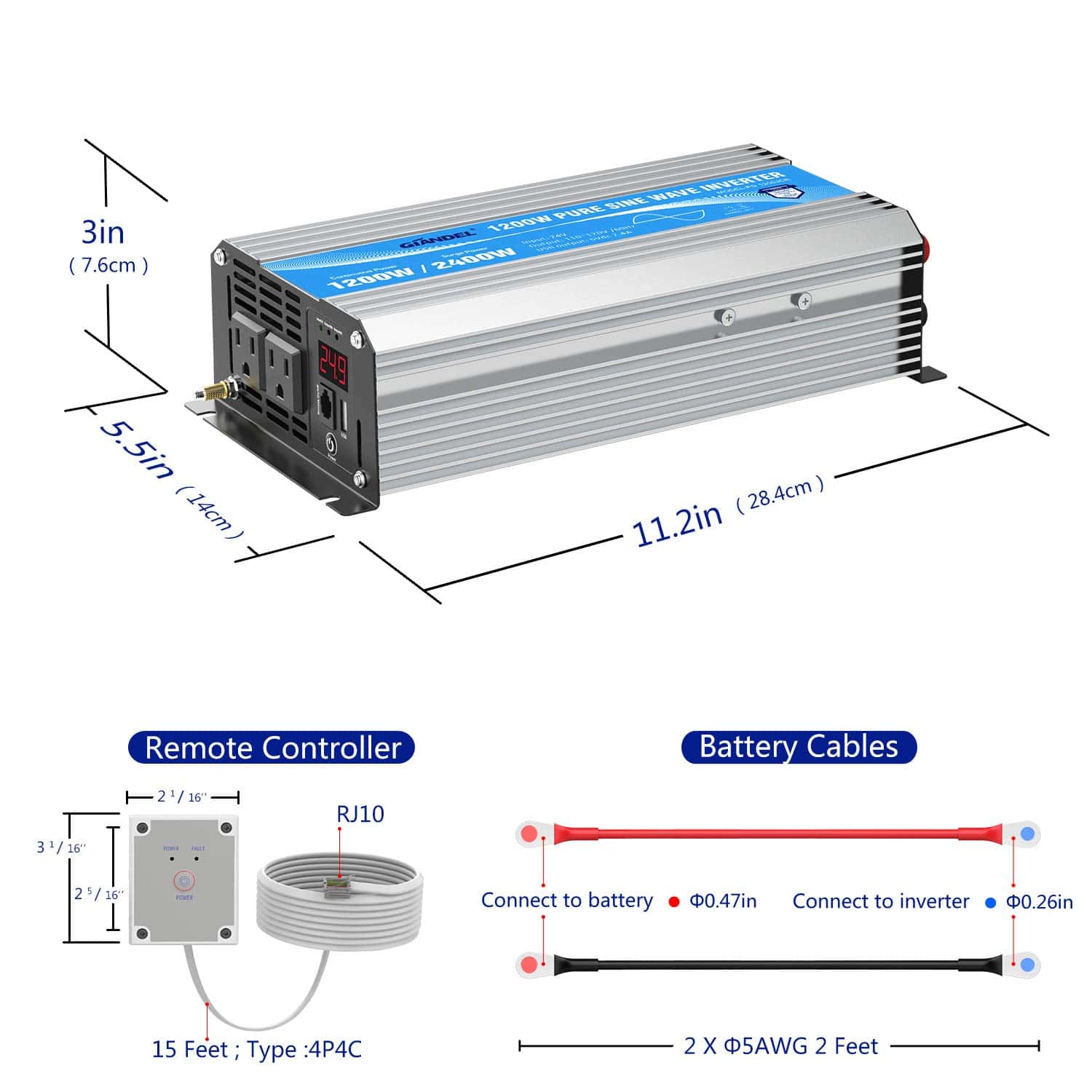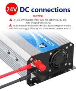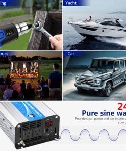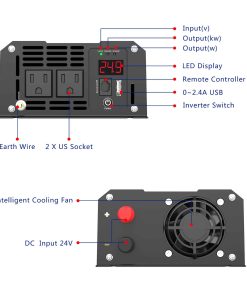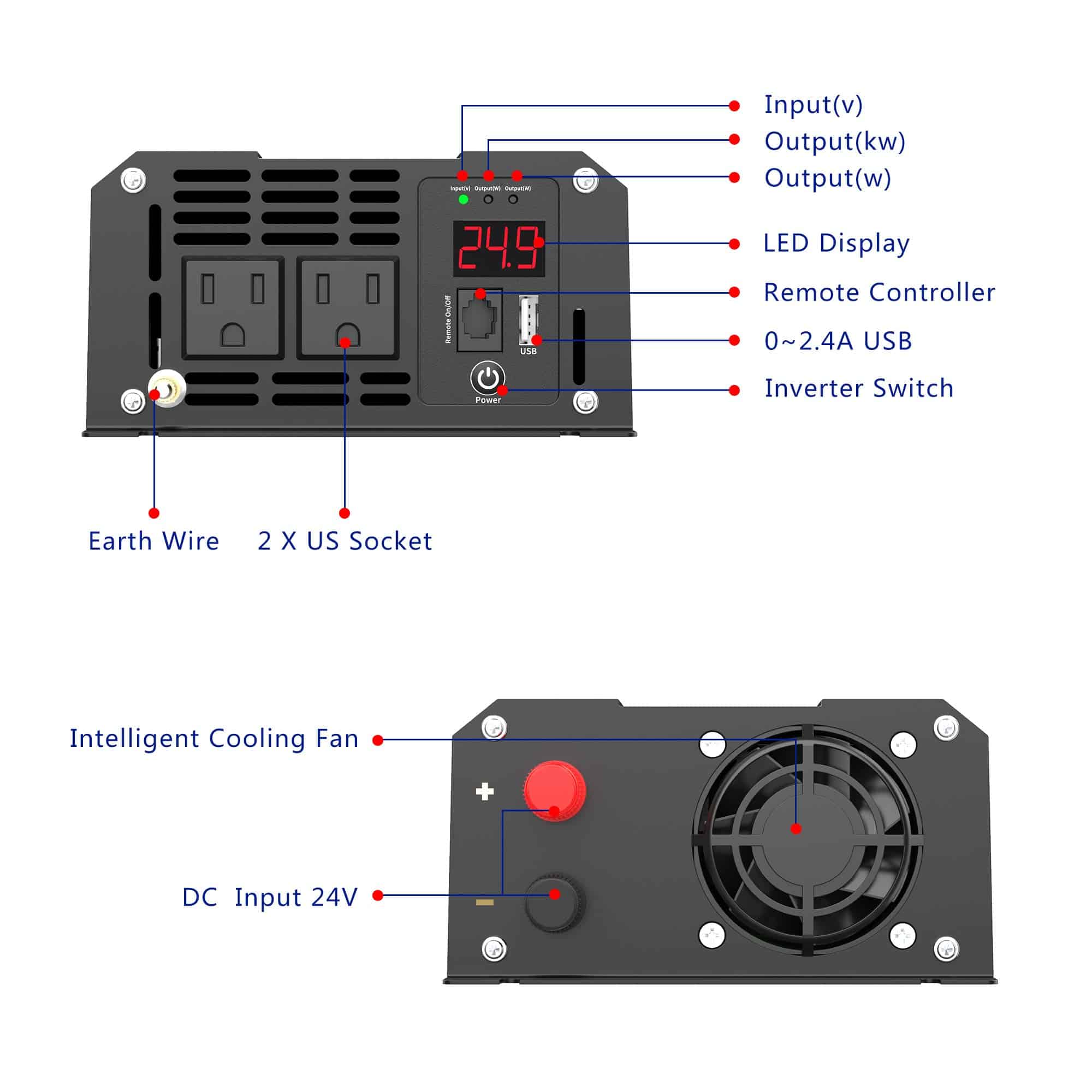 El inversor de corriente de onda sinusoidal pura de 24V proporciona 1200 vatios de potencia continua para la mayoría de los electrodomésticos como ventiladores, neveras, congeladores, portátiles, compresores de aire, dispositivos médicos, etc. Cuenta con protecciones múltiples: protección contra sobretensión, baja tensión, sobrecarga, cortocircuito, sobrecalentamiento, protección de polaridad inversa (fusible) y tecnología de arranque suave. Con pantalla LED que muestra los modos de protección, voltaje de la batería y potencia de salida. Incluye control remoto para encender/apagar el inversor a una distancia de 15 pies. La carcasa de aleación de aluminio resistente y duradera proporciona una protección avanzada contra golpes e impactos. El ventilador de refrigeración inteligente ayuda a reducir el calor y evitar cortocircuitos. Garantía de 18 meses.