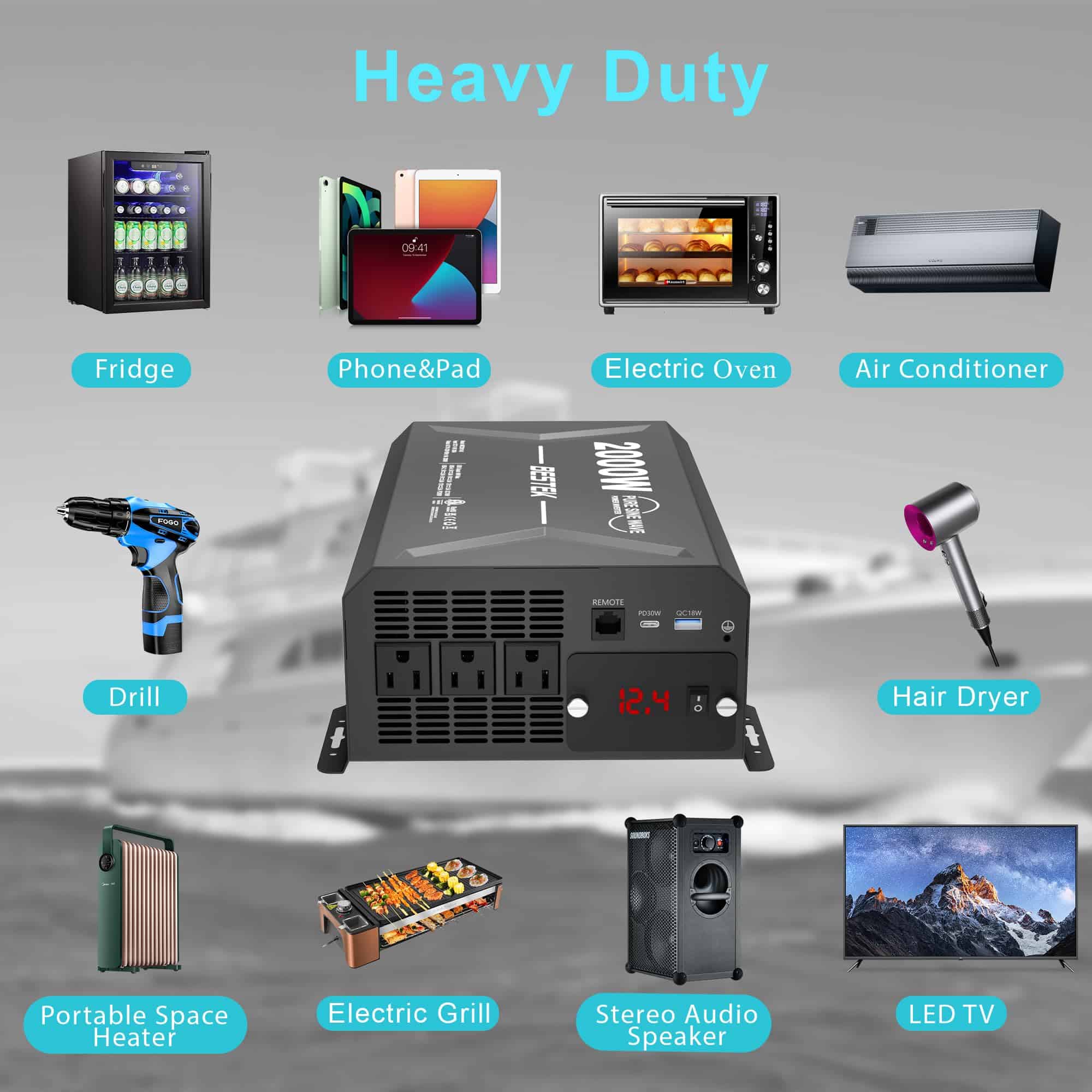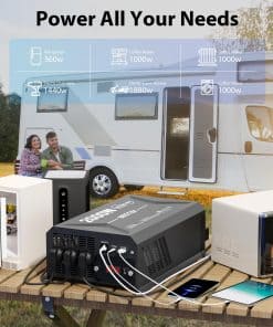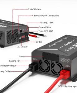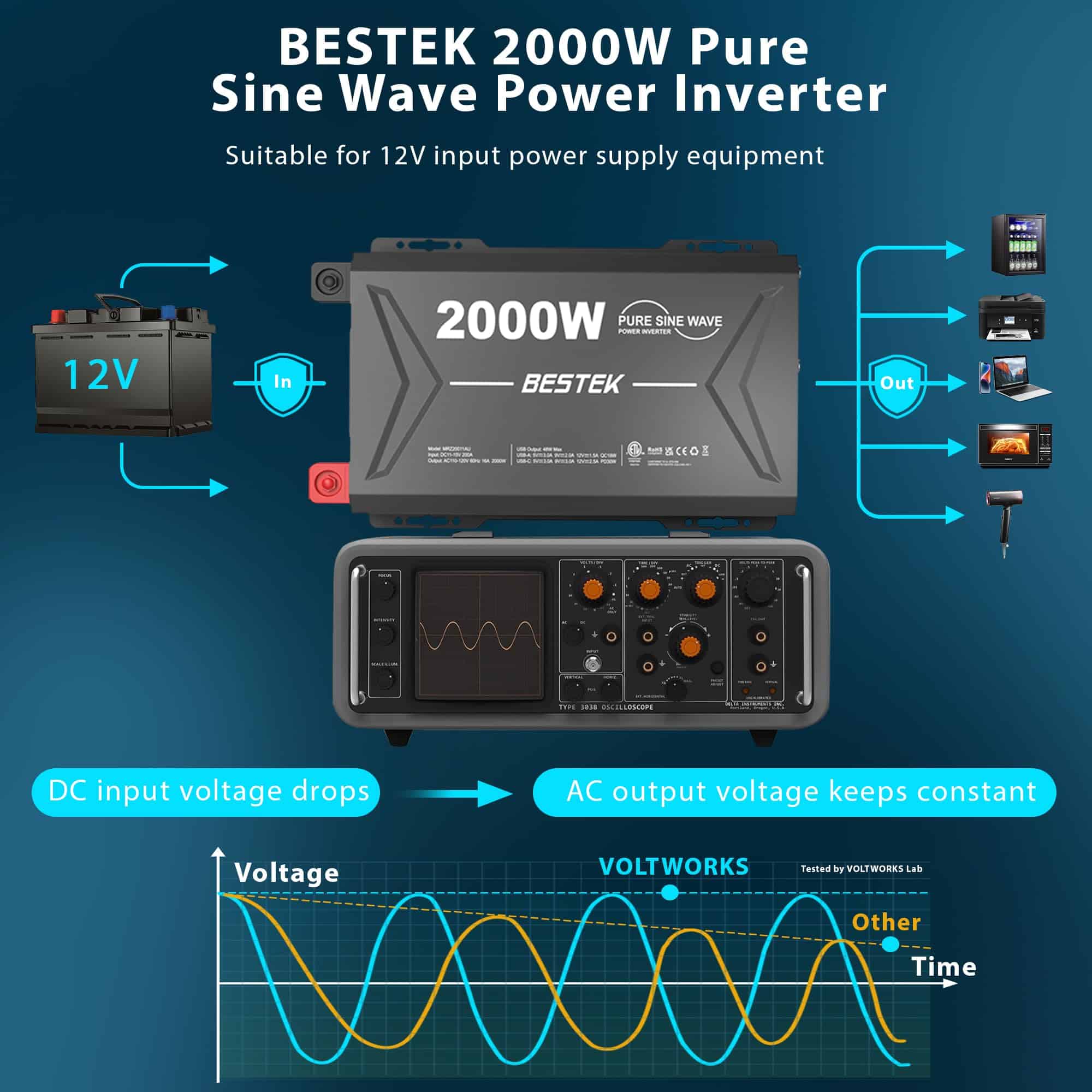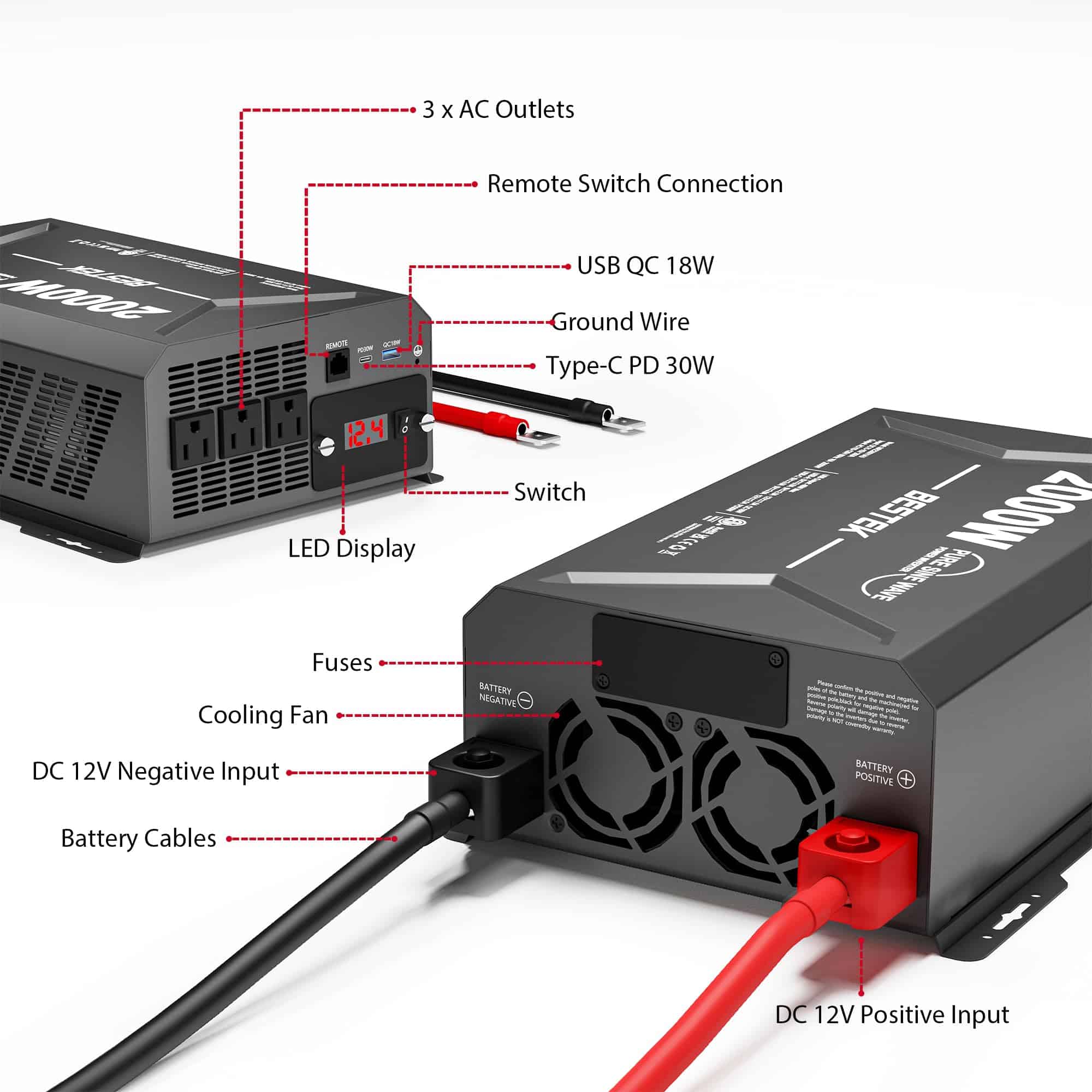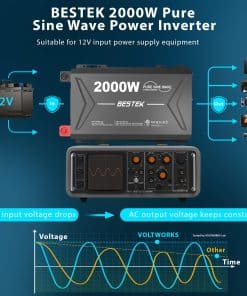 El inversor de corriente de onda sinusoidal pura de 2000 vatios de BESTEK convierte la corriente continua de 12V DC en corriente alterna de 110V/120V AC con una potencia máxima de 4000 vatios, ideal para uso en sistemas fuera de la red como en vehículos recreativos, camiones semirremolque, vehículos marinos y más. Con su forma de onda de salida similar a la de la red eléctrica convencional, se garantiza un suministro de energía sin interrupciones para equipos electrónicos sensibles. Además, cuenta con múltiples salidas, incluidas 3 tomas de corriente estándar de EE. UU., así como puertos de carga rápida USB-A (QC18W) y Tipo-C (PD30W) para satisfacer todas sus necesidades de energía.