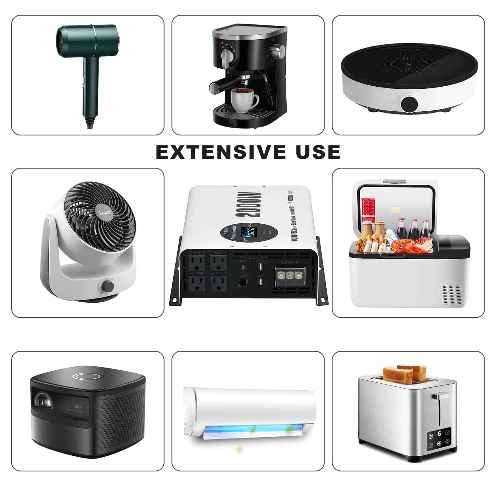 5. Diseño Amigable para el Usuario: El Inversor de Corriente 2000W es fácil de usar, cuenta con 4 tomas de corriente AC, 1 terminal de conexión AC, 2 puertos de carga rápida USB-A QC3.0, 1 puerto USB-C PD30W. Alimenta dispositivos electrónicos y electrodomésticos sensibles como laptops, smartphones, televisores, herramientas eléctricas, tostadoras, cafeteras, hornos microondas, etc.