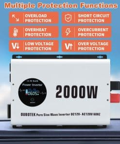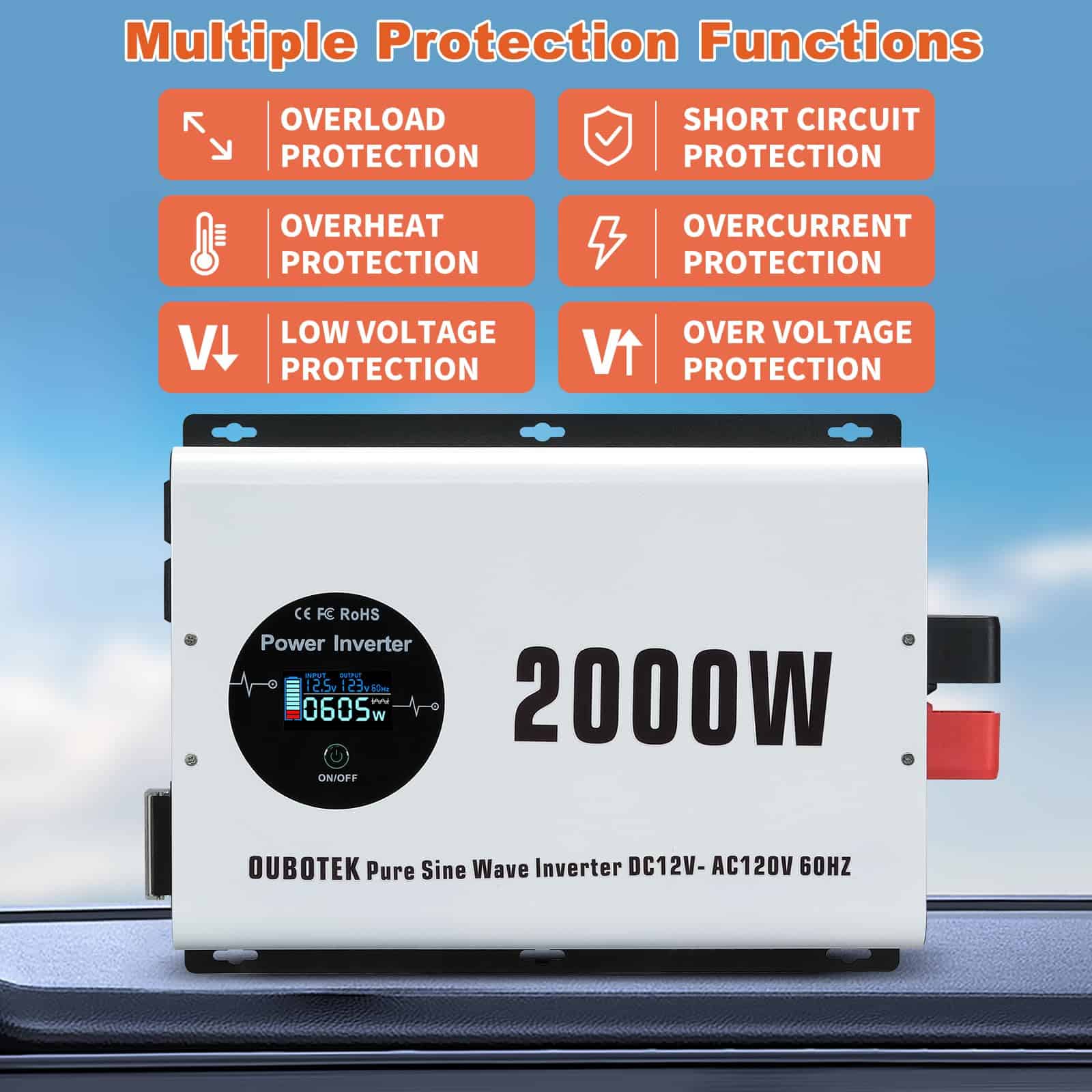 1. Potente Rendimiento de 2000W: El inversor de onda sinusoidal pura de OUBOTEK convierte 12V DC a 110V/120V AC, proporcionando una onda sinusoidal real para un funcionamiento suave y eficiente de tus dispositivos. Inversor con una potencia continua de 2000W, una potencia pico de 4000W, es perfecto para viajes, vehículos, hogar y sistemas solares fuera de la red.