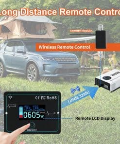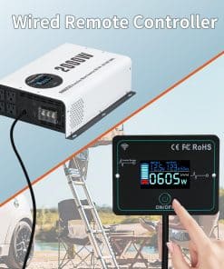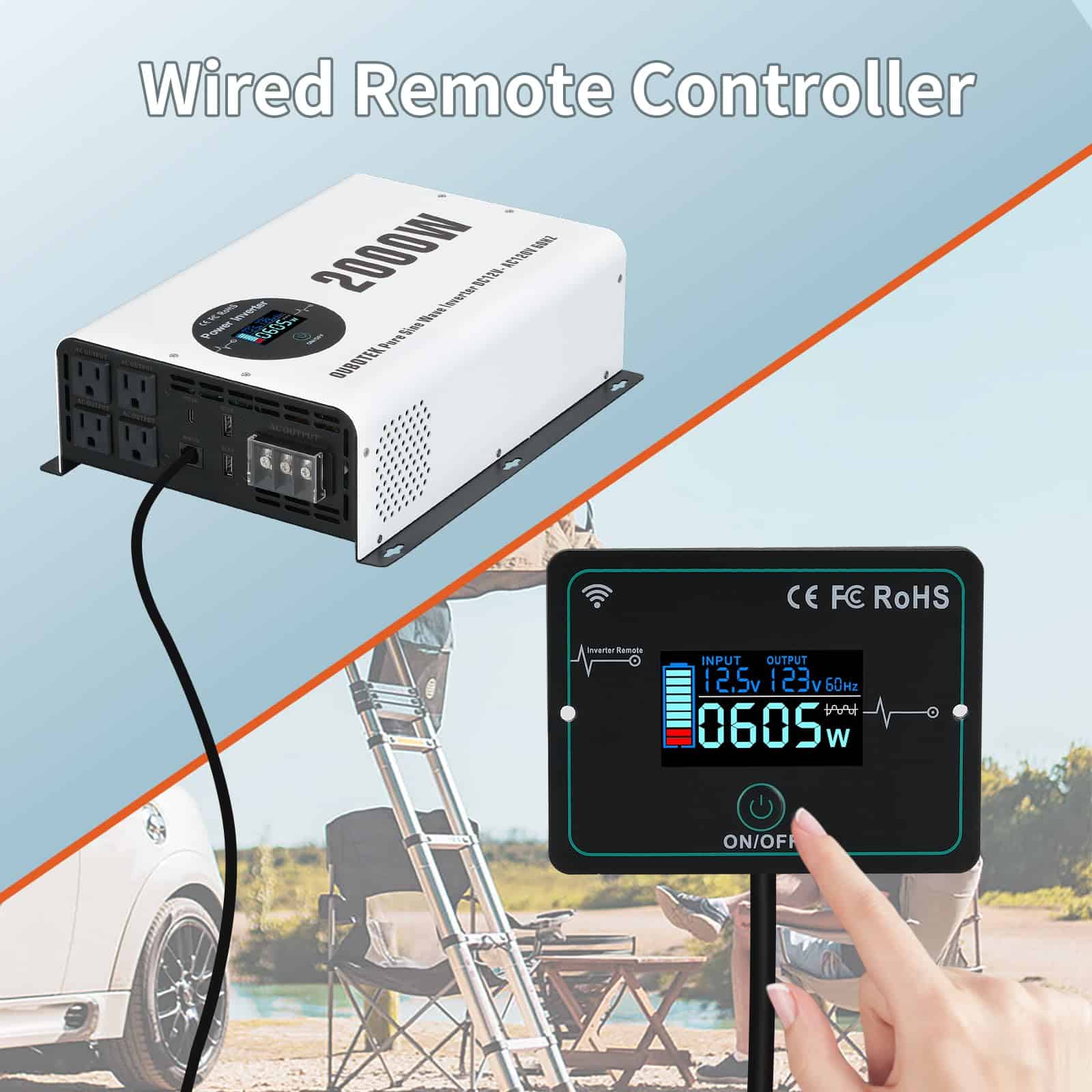 2. Avanzado Control Remoto 3-en-1: El Inversor 2000W con un control remoto mejorado que funciona de forma inalámbrica (164-328 pies), con cable (9.8 pies), y una pantalla LCD remota. Asegúrate de que el interruptor del inversor esté APAGADO al usar el control remoto. Para la funcionalidad inalámbrica, conecta el Módulo Remoto al puerto remoto del inversor. Para la conexión por cable, usa el cable remoto para conectar el mando remoto al puerto remoto del inversor.