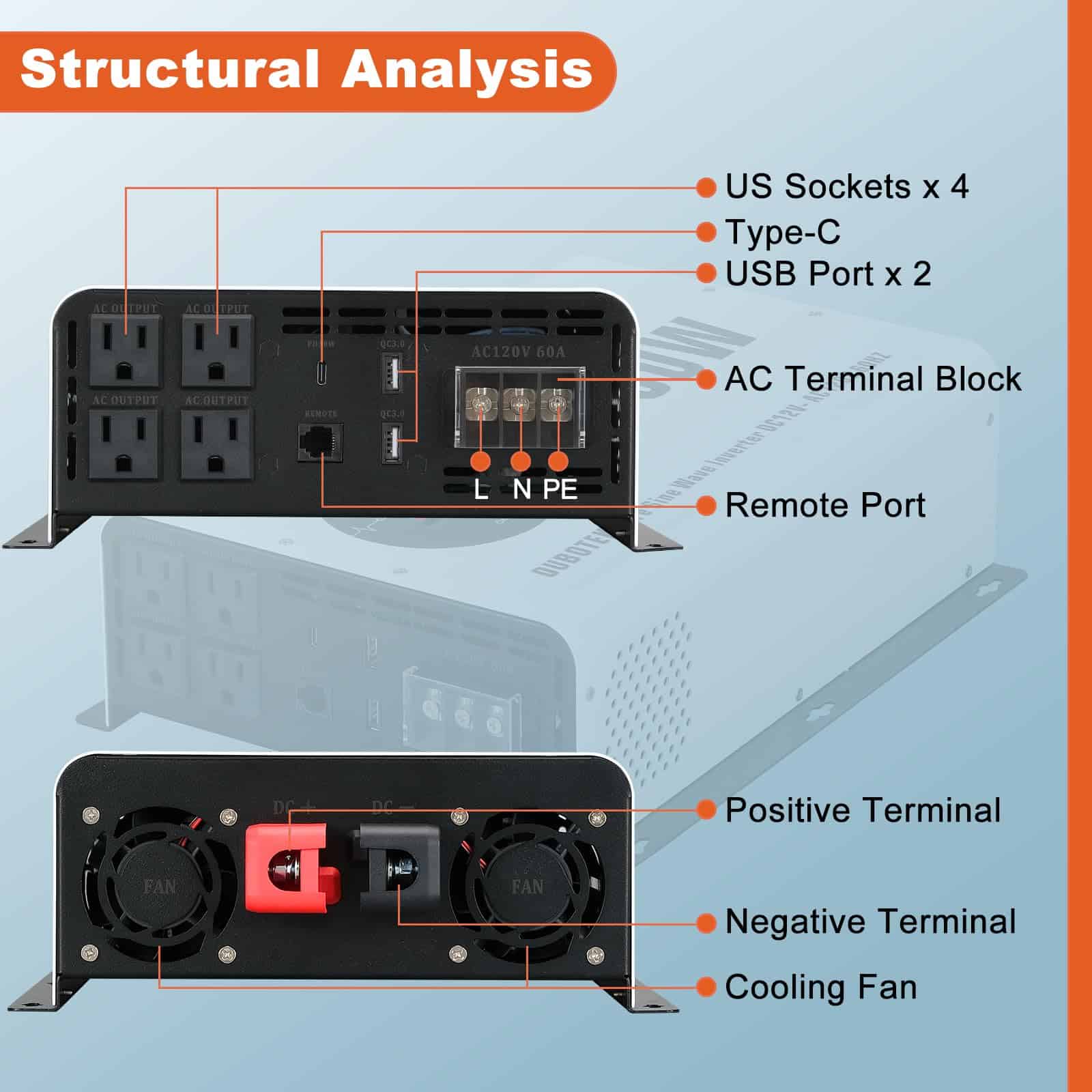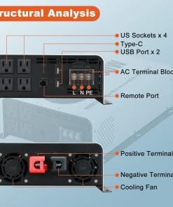 4. Seguridad y Multi-Protección: El inversor de 2000W opera de forma segura y fiable con una gama de funciones de protección: protección contra sobretensión, protección contra baja tensión, protección contra sobrecalentamiento, protección contra sobrecarga y protección contra cortocircuitos. Este inversor de onda sinusoidal pura se integra con ventiladores de refrigeración inteligentes. Y viene con 6 fusibles de 50A para proteger tus dispositivos conectados.