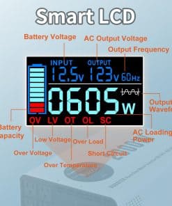 3. Pantalla LCD Digital Intuitiva: El inversor de corriente está equipado con una pantalla LCD digital, fácil de monitorizar el estado de funcionamiento del inversor de RV. Verifica la tensión de la batería, nivel de la batería, tensión de salida de CA, frecuencia de salida, forma de onda de salida, potencia de carga de CA y códigos de error de protección (OV, LV, OT, OL, SC).