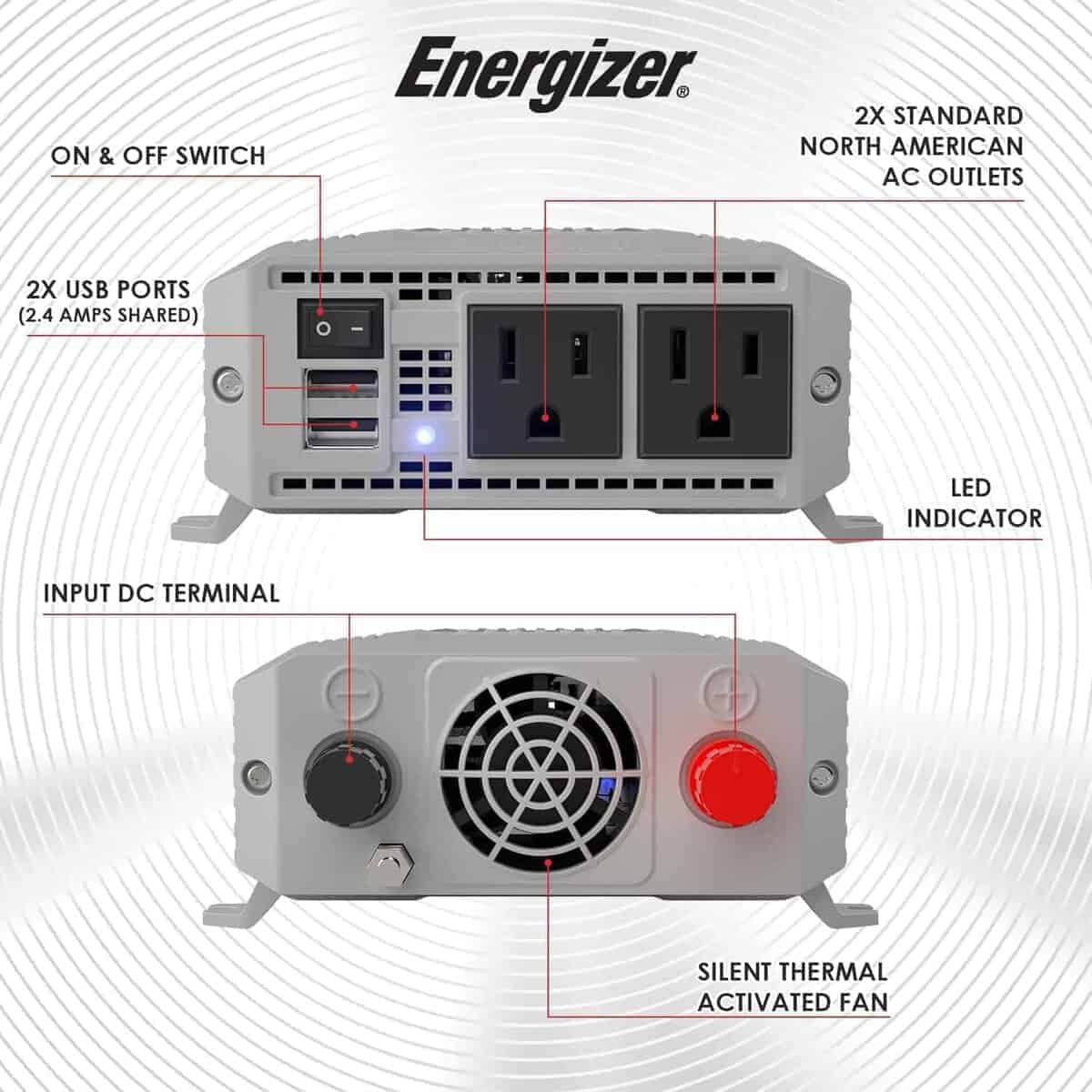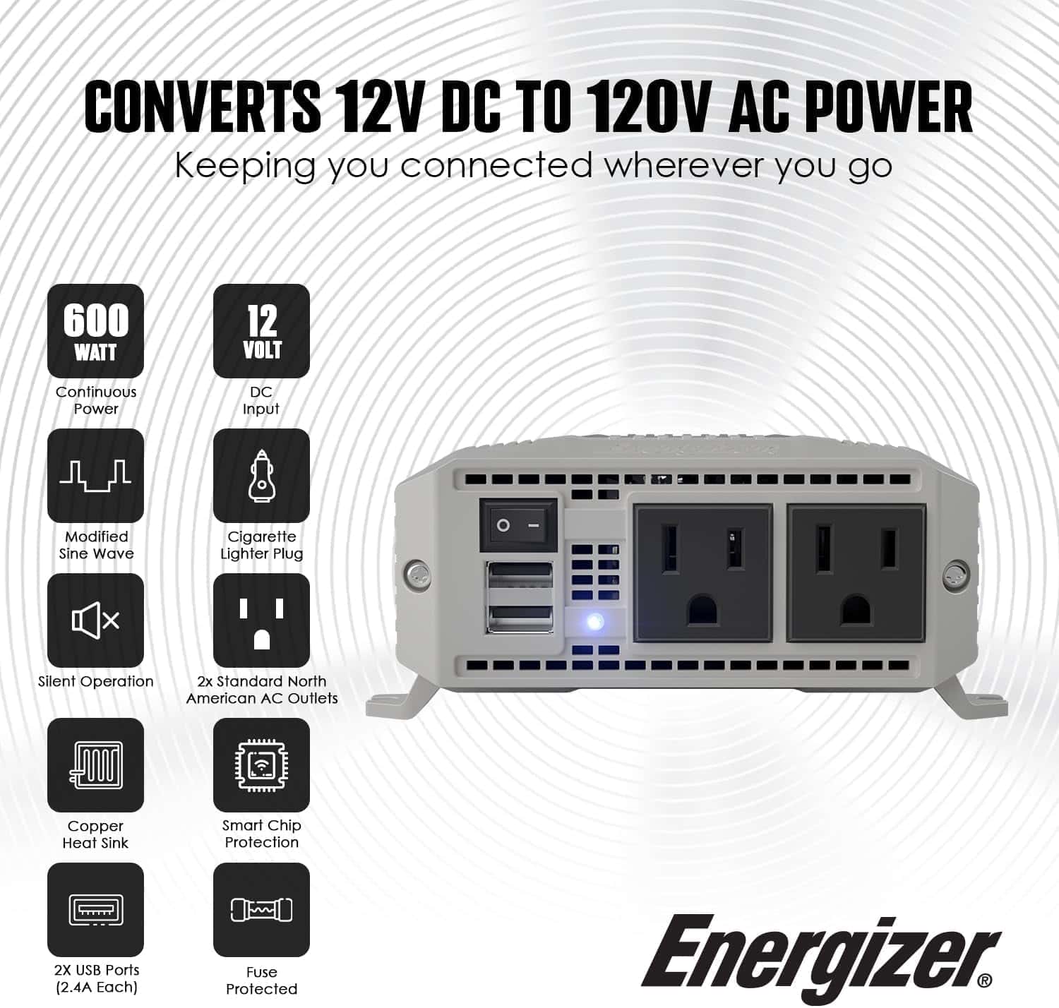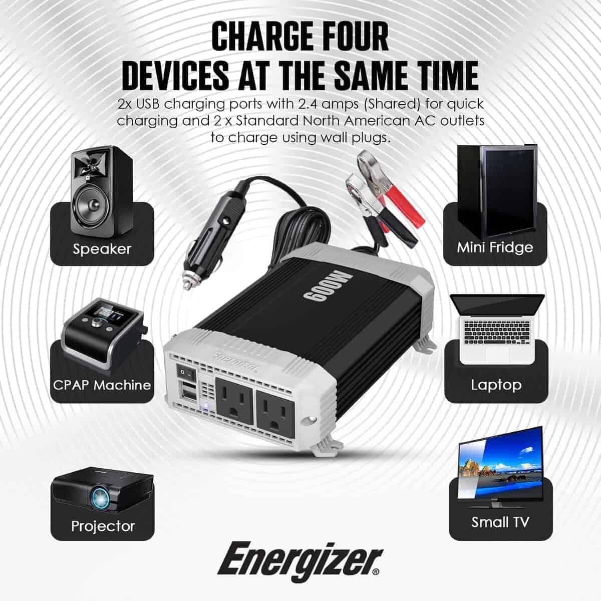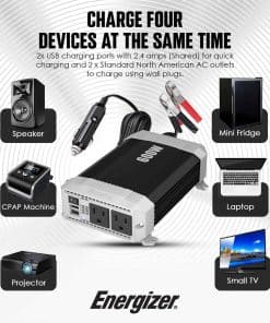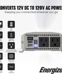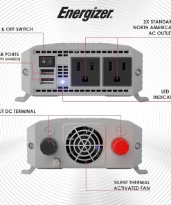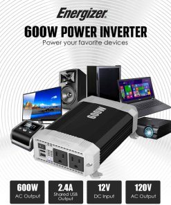 Inversor de corriente para automóvil Energizer de 600 vatios de 12V DC a 110V AC, onda sinusoidal modificada, 2 salidas, 2 puertos USB, enchufe para encendedor de cigarrillos y pinzas. Este potente inversor de corriente de Energizer te permite mantener tus dispositivos electrónicos cargados y funcionando cuando estás en movimiento. Con 600 vatios de potencia continua y 1200 vatios de potencia máxima, podrás utilizar una amplia variedad de dispositivos mientras estás en tu auto, camioneta, furgoneta, remolque o RV.