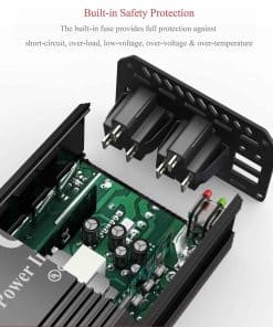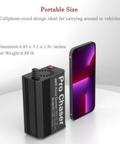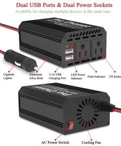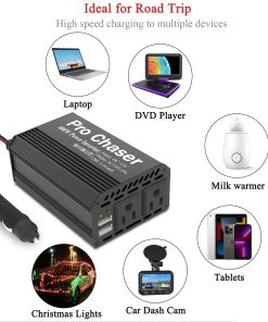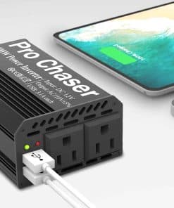 Inversor de potencia Pro Chaser para auto de 400W 12V DC a 110V AC es tu fuente de energía esencial en movimiento. Cuenta con dos tomas de corriente alterna de 110V y dos puertos USB para una amplia compatibilidad. Los adaptadores USB a USB Tipo C están incluidos, aumentando la flexibilidad al convertir los puertos USB a USB C, lo que hace que la energía sea accesible para una amplia gama de dispositivos a través de USB, USB C y enchufes estándar de EE. UU. Ideal para viajes por carretera, se conecta a un cargador de encendedor de cigarrillos, alimentando dispositivos como teléfonos inteligentes, tabletas, computadoras portátiles y pequeños electrodomésticos directamente desde tu vehículo. El diseño es compacto y fácil de transportar, cabe fácilmente en tu vehículo, con un cable de 30 pulgadas para extender el alcance. Perfecto para viajes por carretera, acampar y vacaciones. La seguridad está integrada con protección contra cortocircuitos, sobrecargas y temperaturas extremas, con un ventilador de enfriamiento automático y una garantía de 12 meses para mayor tranquilidad.