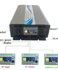 Detalles del producto: Entrada DC: 12V Rango de entrada: 10V-15V Corriente de reposo sin carga: 1.3A Eficiencia: 90% Salida AC: 110V~120V AC Regulación: 3% Frecuencia: 60Hz Toma: Estándar US Alarma de baja tensión: 9.5V-10V Apagado por bajo voltaje: 9V-9.5V Protección de sobrecarga: se apaga, se reinicia manualmente Protección de sobre voltaje: 15.5V Protección contra sobrecalentamiento: se apaga automáticamente, protección contra sobrevoltaje Formas de enfriamiento: el ventilador funcionará cuando la temperatura supere los 45 grados Celsius Precauciones importantes: 1. Utilice los cables de batería estándar incluidos para garantizar una potencia de salida completa. Los fusibles de repuesto son para sustitución en caso de fallo. 2. No conecte el inversor a la red eléctrica ni haga conexiones incorrectas de polaridad. 3. Evite la sobrecarga, especialmente con cargas inductivas, utilice un inversor con potencia continua de 3 a 7 veces mayor que la de sus electrodomésticos. 4. Apague las cargas antes de desconectar el inversor y encienda primero el inversor antes de encender las cargas. 5. Una luz roja intermitente indica un voltaje de entrada ligeramente alto, no afecta su uso. Si el voltaje es demasiado alto, el inversor se apagará automáticamente. Asegúrese de que su batería esté completamente cargada antes de usarla. 6. El voltaje de salida puede ajustarse ligeramente.