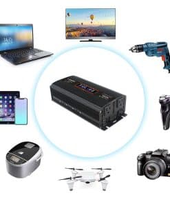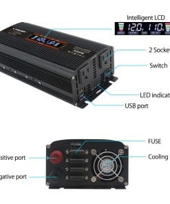 1. SALIDA POTENTE: Convierte la potencia de CC 12V a CA 110V 60Hz. Proporciona 1500 vatios de potencia de onda sinusoidal modificada continua y 3000 vatios de potencia de sobretensión. Con 2 tomas de corriente alterna y 2 puertos USB para cargar múltiples dispositivos. Gran eficiencia: eficiencia de conversión del 85%.
