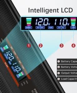 2. PANTALLA LCD INTELIGENTE: La pantalla LCD muestra: voltaje de entrada/salida, capacidad de la batería, capacidad de carga y códigos de error. Fácil de conocer el estado de la batería: lleno, normal o vacío. Fácil de conocer la capacidad de carga. Los códigos de error facilitan la solución de problemas. E-1: Protección por bajo voltaje, E-2: Protección por alto voltaje, E-3: Protección por sobrecalentamiento, E-4: Protección por sobrecarga, E-5: Protección por cortocircuito.