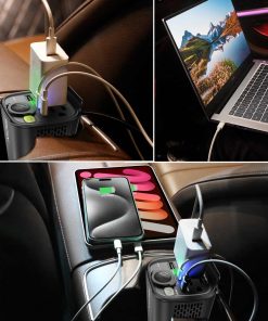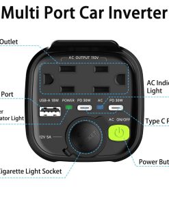 El inversor de corriente para automóvil YIXXI 150W es la solución definitiva para cargar y alimentar tus dispositivos sobre la marcha. Diseñado para convertir la corriente continua (DC) de tu automóvil en corriente alterna (AC), permitiéndote utilizar tus electrónicos y electrodomésticos donde sea que estés. Equipado con 2 tomas de corriente alterna de 110V 60HZ, 1 puerto USB de carga rápida de 18W y 2 puertos de carga tipo C de 30W, además de una toma de encendedor de cigarrillos de 12V. Protecciones múltiples para garantizar la seguridad durante el uso, incluyendo protección contra conexión invertida, sobrecarga, cortocircuito, sobre voltaje, sobrecalentamiento, impacto, sobre corriente, y bajo voltaje. Ideal para cargar laptops, reproductores de DVD, Kindle, celulares, iPads, tabletas, cámaras, afeitadoras, aspiradoras para automóviles y otros dispositivos electrónicos. Compacto y portátil, perfecto para usar en vehículos durante viajes largos.