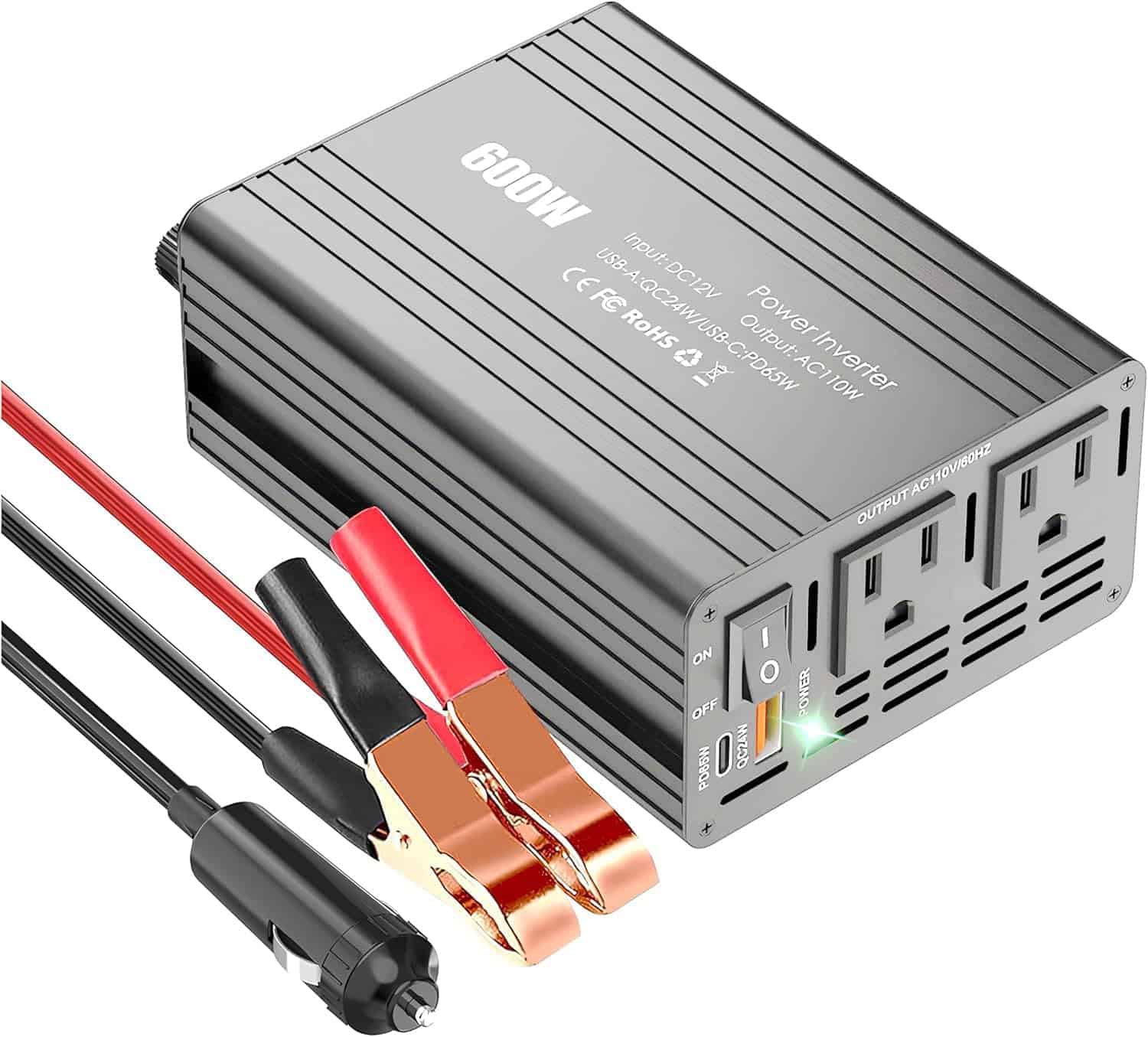 Inversor de corriente portátil para automóvil BieiFAU: 600W 12V a 110V convertidor de CC a CA con puerto USB-A y USB-C y 2 salidas de CA, ideal para viajes por carretera y camping. Equipado con puertos de carga versátiles y potentes salidas de CA, este inversor ofrece una solución de energía conveniente para múltiples dispositivos. Su diseño seguro y confiable, con características de protección de circuitos y opciones de energía flexibles, lo hacen perfecto para uso en viajes y actividades al aire libre. Ya sea que necesites cargar tus dispositivos electrónicos o utilizar pequeños electrodomésticos, este inversor es la opción ideal para mantenerte conectado y alimentado mientras estás fuera de casa.
