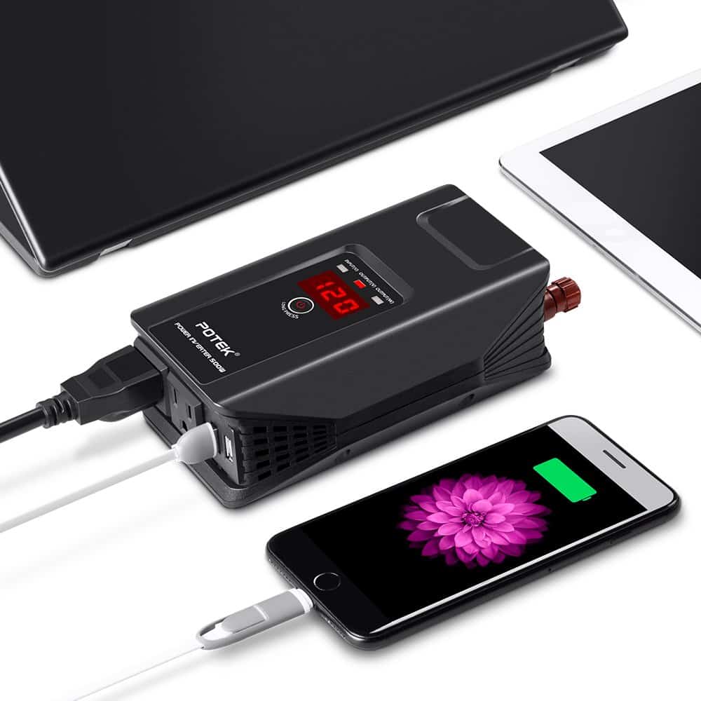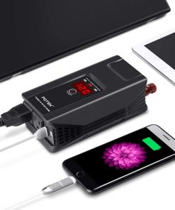 Inversor de corriente para coche Potek de 500W con dos salidas de corriente alterna de 110V y 2 puertos USB: proporciona 1000 vatios de potencia pico. Cuenta con un ventilador de enfriamiento para evitar el sobrecalentamiento y garantizar un entorno silencioso. Además, tiene protección contra sobrecarga, cortocircuito y batería baja. La pantalla digital e iluminada muestra el estado actual del inversor, como la entrada y salida de voltaje y potencia. Extremadamente portátil y ligero, con adaptador para encendedor de cigarrillos y pinzas de batería de coche incluidas para mayor versatilidad de uso.