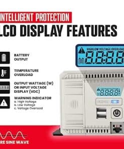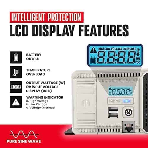3. PROTECCIÓN AVANZADA – Este inversor cuenta con todas las protecciones que necesitará. Sobrecarga, sobre voltaje, bajo voltaje, alta temperatura y cortocircuito. Todas estas protecciones se muestran en la pantalla LCD, así como el voltaje de entrada, la potencia de salida y el nivel de la batería.