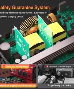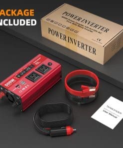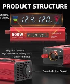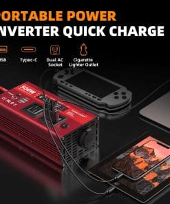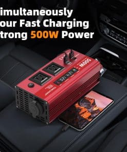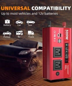 1. POTENTE INVERSOR DE POTENCIA PARA AUTO 500W Este inversor de potencia para vehículos proporciona 500 vatios de potencia continua y 1000 vatios de potencia de pico de CC a CA. Viene con doble toma de corriente alterna de 110V, 3 puertos de carga rápida USB y un puerto tipo-C. Carga tu teléfono y portátil al mismo tiempo, esencial para tus viajes por carretera. 2. FUERTE VENTILADOR Y PANTALLA LED INTELIGENTE Este convertidor de potencia está hecho de una carcasa de aleación de aluminio completa, el ventilador de refrigeración inteligente incorporado ayuda a reducir el calor. La pantalla inteligente mostrará la entrada de CC, la salida de CA y la capacidad de la batería, se mostrará el código de error correspondiente cuando el inversor esté defectuoso. 3. FUNCIÓN DE PROTECCIÓN DE SEGURIDAD MÚLTIPLE El chip inteligente avanzado incorporado reconoce automáticamente el voltaje y la corriente requeridos por diferentes equipos, evitando que la máquina se sobrecaliente, tenga bajo voltaje, sobre corriente, sobre voltaje, sobrecarga y cortocircuito. 4. DOBLE CONEXIÓN CON CABLES MÁS GRUESOS El inversor de 12v a 110v protegerá y prolongará la vida de tus dispositivos electrónicos y electrodomésticos si se utiliza correctamente. Cuando tu dispositivo tenga menos de 150 vatios, puedes conectar directamente a la toma de corriente del coche. Conectar baterías con nuestros cables de pinza más gruesos puede soportar dispositivos electrónicos de mayor potencia. 5. INSTALACIÓN SIMPLE Conectar y Usar. El paquete incluye el inversor y todos los accesorios necesarios. Ideal para cortes de energía, emergencias, vacaciones, coches, RVs, camiones, energía solar, hogares, lugares de trabajo remotos, o cualquier lugar donde se necesite energía CA. Suficiente para dispositivos electrónicos de uso común y la mayoría de entornos laborales como conducción, viajes por carretera o camping