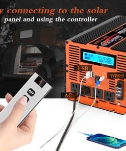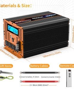 2. Fácil de Controlar: Controle fácilmente el encendido/apagado del inversor en un rango de 100 metros. Es más conveniente usar suministro de energía para automóviles y hogares, y es más fácil controlar el inversor con pantalla luminosa. Monitoree el estado real del trabajo (indicador de batería, alarma de sonido) Consejos: (Antes de usar el control remoto para encender el inversor, debe asegurarse de que el interruptor del inversor mismo esté apagado, y luego use el control remoto para encender el inversor). 3. Proteja su dispositivo: Protección de seguridad perfecta: protección contra sobre voltaje, bajo voltaje, sobrecarga, cortocircuito, sobrecalentamiento, protección de polaridad inversa (fusible). Función de reinicio automático y protección contra fugas a tierra (rayo). La responsabilidad del producto recae en AIG. 4. Extienda la Vida del Inversor: Diseño de entrada/salida aislada y tecnología de inicio suave, la carcasa de aleación de aluminio grande y duradera proporciona una avanzada protección contra caídas y colisiones. Los ventiladores de enfriamiento inteligentes ayudan a reducir el calor y evitar cortocircuitos. 5. Garantía Postventa: Recibirá: Inversor de energía de onda sinusoidal pura JARXIOKE 4000W 12V, cable, control remoto y manual del usuario. Ofrecemos 12 meses de garantía para cada pedido. ¡Si tiene alguna pregunta, contáctenos por correo electrónico!