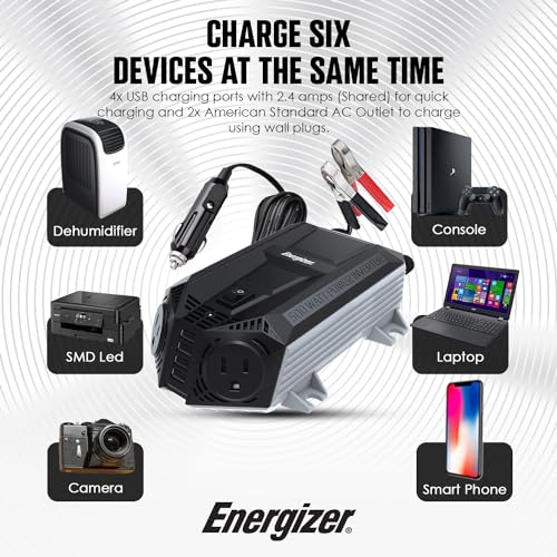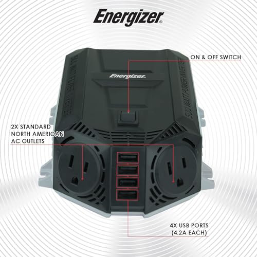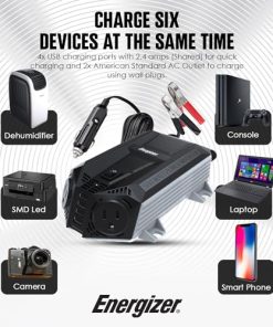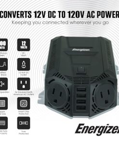 Serie de inversores de energía Energizer (548 vatios) que te permite ejecutar dispositivos eléctricos con este inversor que se conecta a tu encendedor de cigarrillos o se conecta directamente a una batería de automóvil para alimentar laptops, cargadores de teléfonos celulares, pequeños dispositivos electrónicos y más. Cuenta con un ventilador térmico ultra silencioso y cuatro puertos USB de carga de 2.4A (cada uno) – 48W/9.6A en total y dos tomacorrientes AC dobles para cargar dispositivos más grandes de hasta 500W. Probado, validado y aprobado por su seguridad y rendimiento. Aprobado por la ETL bajo las normas UL STD 458 y CSA STD C22.2. Incluye un cable de encendedor de cigarrillos, cables de pinza para batería, una garantía de piezas y mano de obra de 2 años, un equipo de servicio al cliente especializado y soporte técnico de instalación por correo electrónico, chat o teléfono.