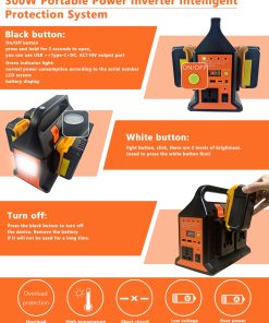Este inversor está diseñado para proporcionar un rendimiento alto, seguro, conveniente y una fuente de energía renovable para la vida, ya sea para la energía de respaldo del hogar, el taller de herramientas, el camping al aire libre y el RV. Se puede llamar Inversor de Suministro de Energía Portátil/Estación de Energía/Banco de Energía Recargable/Mini Luz LED, etc., cuando se inserta la batería de litio adecuada.