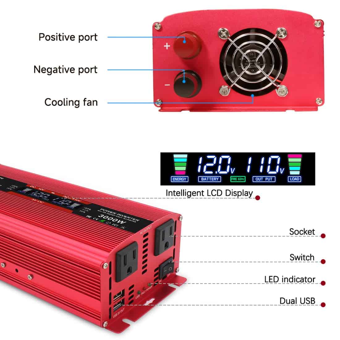 4. DISEÑO ESPECIAL: El cuerpo de aluminio resistente proporciona protección avanzada y es más fácil de refrigerar. Ventilador de refrigeración incorporado con control de temperatura. Neutro de tierra aislado. La construcción resistente permite que el inversor de corriente se destaque en entornos rudos.