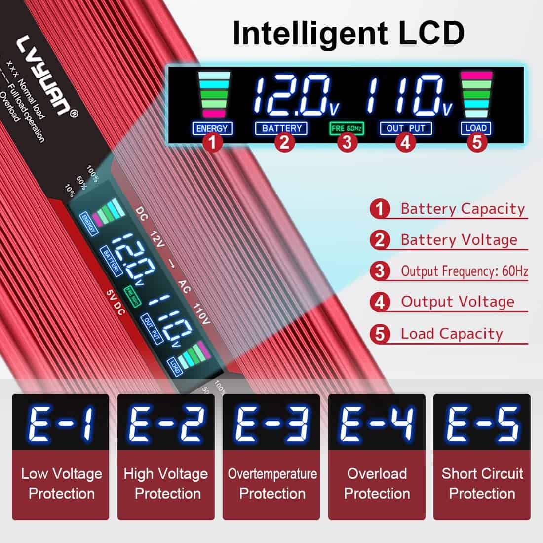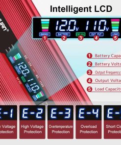 2. PANTALLA LCD INTELIGENTE ACTUALIZADA: Cuando el inversor está funcionando normalmente, la pantalla LED mostrará el voltaje de entrada/salida, la capacidad de la batería/carga. De lo contrario, la pantalla LED mostrará códigos de error, lo que nos permite entender fácilmente cuál es el problema.