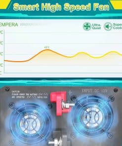 3. Material de grado aeronáutico duradero y ventilador silencioso inteligente El cuerpo del inversor de 2000W está hecho del material de aleación de aluminio de grado aeronáutico más avanzado y duradero, equipado con 2 ventiladores silenciosos inteligentes con un nivel de decibeles inferior a 30, cuando la temperatura excede los 45 C, los ventiladores se encienden automáticamente para proteger al inversor del sobrecalentamiento, lo que puede soportar el ambiente adverso y las malas estaciones y extender la vida útil del equipo.