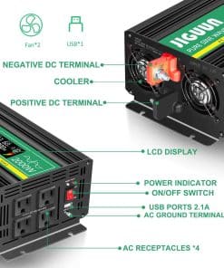 Inversor de onda sinusoidal pura de 2000 vatios JIGUUN de 12v DC a 110/120v AC, convertidor de coche con 4 tomas de corriente CA y 1 salida USB, pantalla LCD para RV camión casa camping. Este es un verdadero inversor de onda sinusoidal pura de 2000W con 4000W de potencia máxima, entrada de 12V CC, salida de 110V CA; 4 salidas CA laterales y 1 puerto de carga USB de 2.1A. Nuestros invertidores producen una energía más limpia, más suave, más silenciosa y más fiable, y proporcionan una mayor capacidad de accionamiento que los invertidores mejorados. Se conecta a TV, refrigerador, taladros, máquinas de fax, estetoscopios o en cualquier lugar donde se necesite energía CA. El inversor está equipado con una pantalla LCD, puede leer al instante el voltaje de entrada y salida, la capacidad de la batería y la potencia de carga, y monitorear el estado de funcionamiento del dispositivo en la pantalla. El cuerpo del inversor de 2000W está hecho del material de aleación de aluminio de grado aeronáutico más avanzado y duradero, equipado con 2 ventiladores silenciosos inteligentes con un nivel de decibelios inferior a 30, cuando la temperatura excede los 45 C, los ventiladores se encienden automáticamente para proteger al inversor del sobrecalentamiento, lo que puede soportar el ambiente adverso y las malas estaciones y extender la vida útil del equipo. El inversor JIGUUN está diseñado con protección integral. El sistema BMS mejorado puede proteger completamente el equipo, apagado por sobrecalentamiento, protección automática de sobrecarga, protección de sobretensión y subtensión, alarma sonora de baja tensión, protección contra cortocircuitos, protección de polaridad inversa, terminal de tierra de CA, no es necesario preocuparse por que la máquina se queme o explote. Adecuado para automóvil, RV, hogar, viajes, campamentos, navegación, emergencias, etc. Incluye 1x Inversor de Onda Sinusoidal Pura de 2000W DC 12V a AC 110V, 1x Manual de Usuario, 1 juego de Cables de Batería (1xRojo, 1xNegro), 4 fusibles de 30A. 1 año con reemplazo gratuito y servicio al cliente, si tiene alguna otra pregunta, no dude en contactarnos por correo electrónico. El equipo de JIGUUN lo resolverá para usted. A continuación, se encuentran las instrucciones de instalación y manuales de solución de problemas, que se pueden descargar por sí mismo. (NOTA: Fusible incorporado, no es necesario instalarlo).