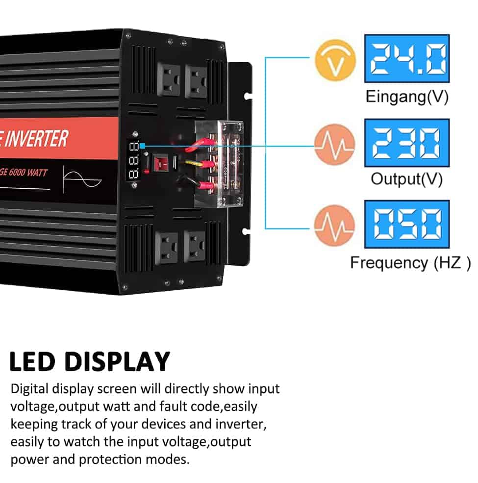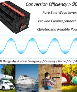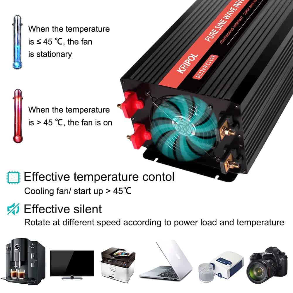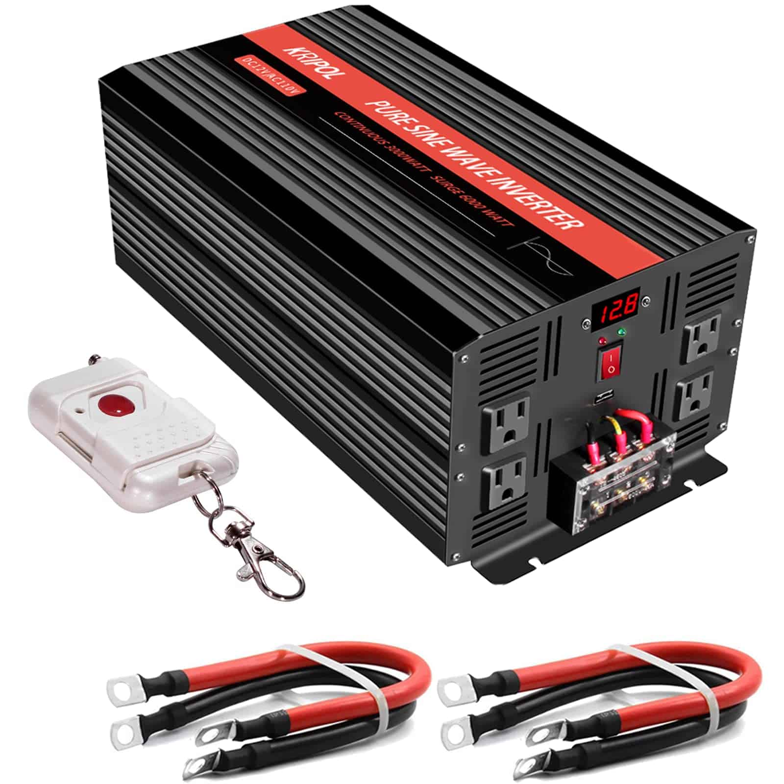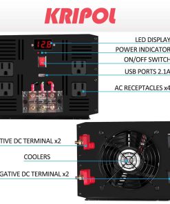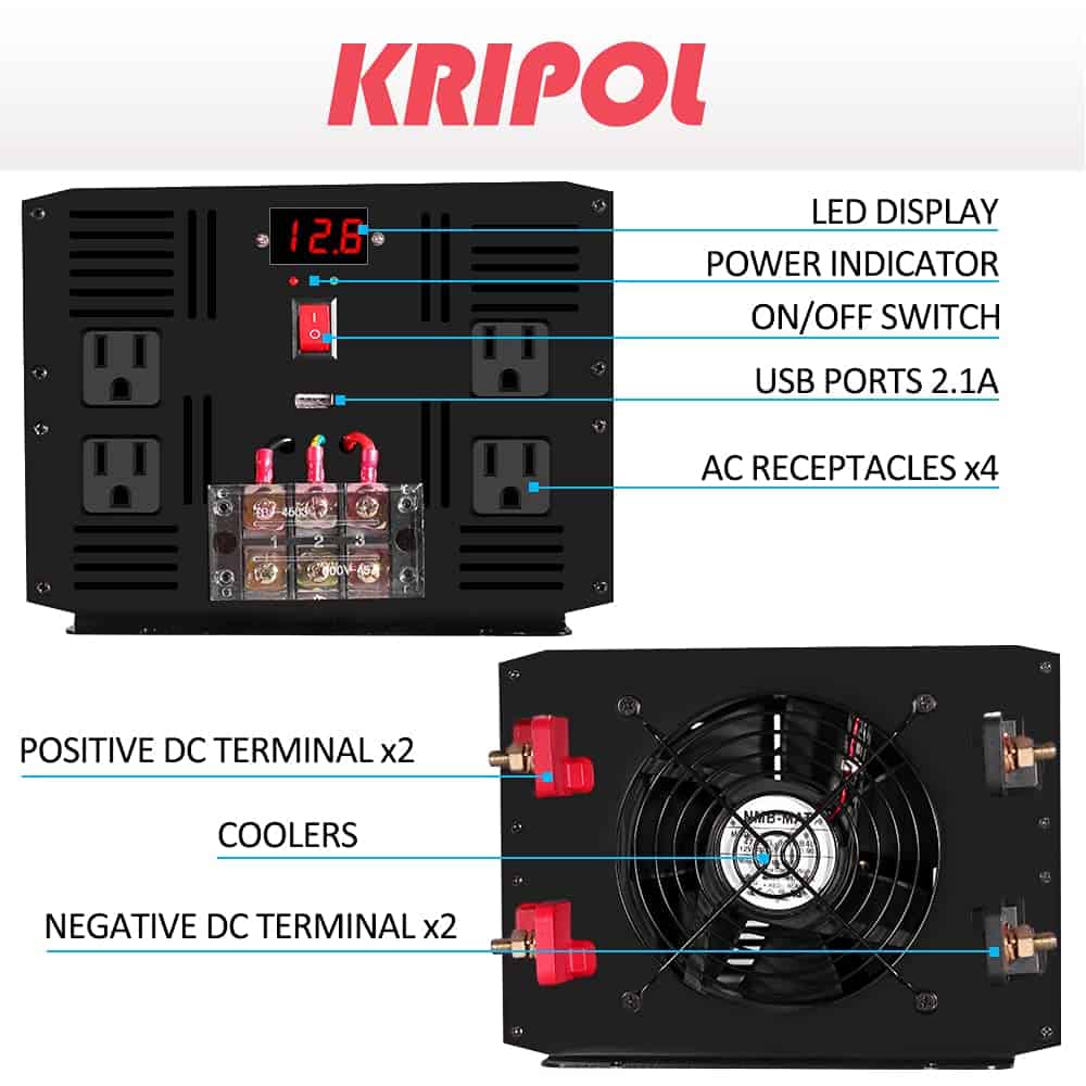 1. Inversor de Onda Sinusoidal Pura de 3000W: Inversor de Onda Sinusoidal Pura Kripol con una potencia nominal continua de 3000W, pico de 6000W, entrada DC 12V, salida AC 110V. Lado AC con 4 salidas de CA, un puerto de carga USB de 2.1A y pantalla digital. Proporciona energía más limpia, más suave, más silenciosa y más confiable, eficiencia de conversión del 90%, mejor protección para equipos sensibles.