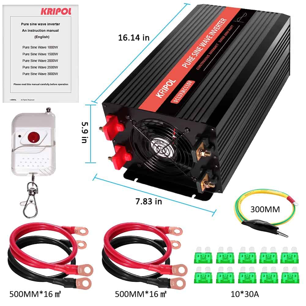 5. Juego Completo y Garantía: 1x Inversor de Onda Sinusoidal Pura DC 12V a AC 110V 3000W, 1x Manual de Usuario, 2 Juegos de Cables de Batería (2xRojo,2xNegro), 1x control remoto, 10 fusibles de 30A. 1 año de garantía con reemplazo gratuito y servicio al cliente de por vida, si tiene alguna otra pregunta, no dude en contactarnos por correo electrónico. ¡El equipo Kripol lo resolverá por usted! (NOTA: Fusible incorporado, no es necesario instalarlo)