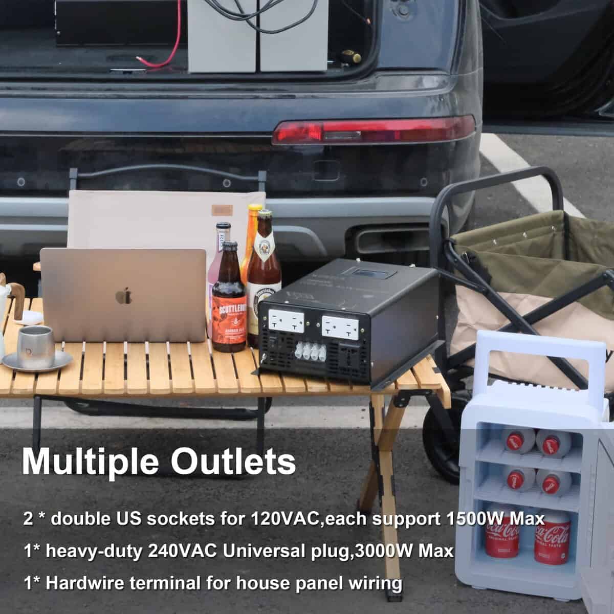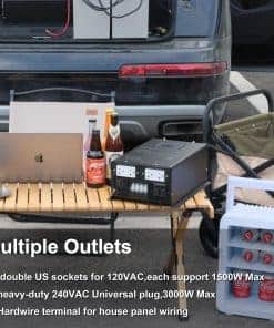 Inversor de energía de onda sinusoidal pura de fase dividida que proporciona 4000 vatios de potencia continua verdadera de onda sinusoidal DC 24V a 120V/240V AC de fase dividida, con una salida de alta calidad y estable de potencia, 60Hz, alta frecuencia. Ideal para electrodomésticos sensibles bajo cargas de hasta 4000W para sitios de trabajo, RV y respaldo de emergencia para toda la casa. La pantalla LCD digital facilita controlar el uso de energía, mostrando el voltaje y la capacidad de la batería, rastreando simultáneamente 3 circuitos de salida para voltios y amperios en modo dual de 120VAC, voltios y frecuencia en modo de 240VAC, permitiendo conocer fácilmente el estado de funcionamiento del inversor de energía. Cuenta con 2 circuitos de salidas de CA 120V (AC1 y AC2) con 4 tomas de corriente domésticas, permitiendo a cada circuito soportar una salida de 2000W, 1 enchufe universal de 240VAC resistente y un terminal de cableado con múltiples salidas (L1+L2 240V, L1+N 120V, L2+N 120V). Con una eficiencia de hasta un 91,6%, puede proporcionar una corriente máxima de 16,6A en el circuito de 240V, adaptado para electrodomésticos de alta potencia de 240VAC. Admite un terminal de cableado de un máximo de 16,6A y circuitos de salidas dual de 120V 16,6A: AC1 y AC2 pueden soportar una salida de 2000W simultáneamente. El diseño de arranque suave con arrancador suave incorporado, reduce el impacto instantáneo de la corriente de arranque permitiendo que el voltaje de CA suba suavemente, extendiendo eficazmente la vida útil del electrodoméstico