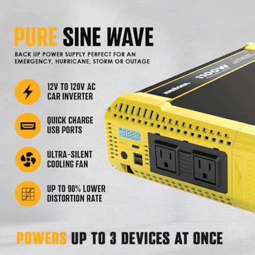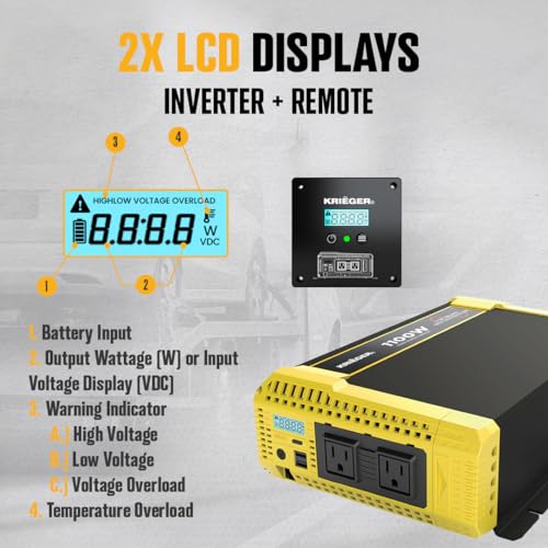 El Inversor de Onda Sinusoidal Pura Krieger de 1100W 12V a 120V AC es la solución perfecta para transformar la potencia de DC a AC de forma eficiente y confiable. Con una potencia continua de 1100W y una potencia máxima de sobrecarga de 2200W durante el arranque de la carga, este inversor proporciona ondas senoidales puras con una eficiencia de conversión del 90%, lo que reduce la pérdida de conversión y garantiza un suministro de energía estable y seguro.