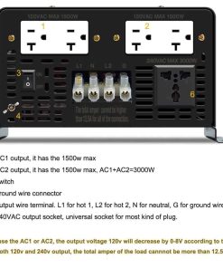 El Inversor de Corriente de Onda Sinusoidal Pura en Fase Dividida proporciona 3000 vatios de potencia continua verdaderamente pura de onda sinusoidal de 48V a 120V/240V AC en fase dividida, con una salida de alta calidad y estable a 60HZ de alta frecuencia. Es ideal para electrodomésticos de cargas sensibles por debajo de 3000 vatios para obras, RV y respaldo de emergencia de toda la casa. Incluye una pantalla digital LCD para el monitor de uso de potencia sin esfuerzo que muestra el voltaje y la capacidad de la batería, seguimiento simultáneo de 3 circuitos de salida para el voltaje y amperios del modo dual de 120VAC, voltaje y frecuencia del modo de 240VAC, permitiéndote controlar fácilmente el estado de funcionamiento del inversor de corriente. Cuenta con 2 circuitos de salida AC de 120V (AC1 y AC2) con 4 tomas de corriente de uso doméstico, cada circuito puede soportar una salida de 1500W, 1 enchufe universal de servicio pesado de 240VAC y un terminal a presión con salida múltiple (L1+L2 220V, L1+N 110V, L2+N 110V). Con una eficiencia de hasta el 91.6%, una corriente máxima de salida de 12.5A en el circuito de 240V, el inversor se adapta perfectamente a los electrodomésticos de alta potencia de 240VAC. Admite un terminal a presión máximo de 12.5A y circuitos duales de salida de 120V 12.5 amperios: AC1 y AC2 pueden soportar una salida de 1500W al mismo tiempo. Diseño Soft Starter con arranque suave incorporado, reduce el impacto instantáneo de la corriente de entrada para permitir que el voltaje de CA aumente suavemente, extendiendo efectivamente la vida útil del electrodoméstico. Cuenta con protecciones de seguridad completas como Diseño de Entrada/Salida Aislado, bajo voltaje de entrada, alto voltaje de entrada, sobrecarga, temperatura, cortocircuito y reversa de batería para garantizar un funcionamiento seguro y confiable.