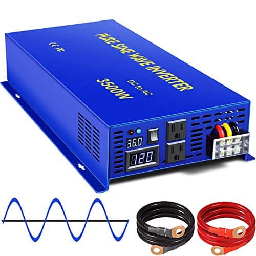 XYZINVT inversor de energía de onda sinusoidal pura diseñado como un generador de energía portátil para alimentar múltiples elementos para viajes en automóvil y uso en el hogar. Como respaldo, es ideal para emergencias por cortes de energía. Puede generar siempre la energía cuando y donde la necesites. Características: 1. Baja interferencia: ofrece una energía de onda sinusoidal pura ultra limpia que es la misma que la energía de la red de CA suministrada por su utilidad. Mejora el rendimiento del equipo de CA con tecnología de baja interferencia, buena opción para televisión, estéreo, etc. Ideal para cargas sensibles como instrumentos de alta precisión. 2. Bajo consumo de energía en reposo: reduce la pérdida del circuito y mejora la eficiencia de los electrodomésticos. 3. Aplicación fuera de la red: ideal para uso de emergencia siempre que tenga su batería completamente cargada. Puede generar su propia electricidad para su hogar donde haya cortes de energía o interrupciones. 4. Toma de corriente alterna doble de EE.UU. y pantalla digital LED: alimente diferentes dispositivos al mismo tiempo sin problemas y controle los cambios de voltaje en cualquier momento. 5. Operación fácil: fácilmente trasladado a diferentes unidades con conexiones rápidas. Se puede utilizar en sistemas solares y eólicos también. Cargue su batería con panel solar con el controlador de carga solar. solo enchufar y listo. Especificaciones: Entrada de CC: 36V Rango de entrada de CC: 33V-42V Consumo de corriente sin carga: 1.5A Eficiencia: 85%-90% Voltaje de salida de CA: 120V Regulación de CA: 3% Frecuencia: 60Hz Enchufe: tipo de EE.UU. de 15A Alarma de voltaje bajo: 30-33V Apagado por voltaje bajo: 29V-33V PAQUETE CONTIENE: 1x Inversor de Potencia de 3500W, 2x juego de cables de batería, 1x interruptor remoto, 1x Manual de Usuario, Llave, Varios fusibles, nuestra garantía de 12 meses y servicio al cliente 100%.