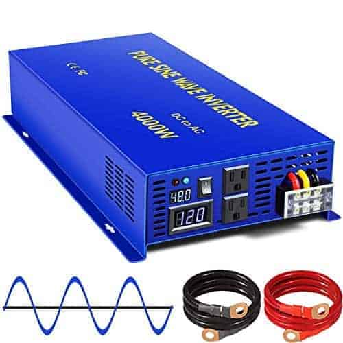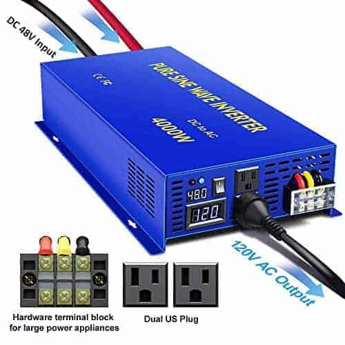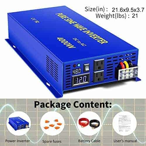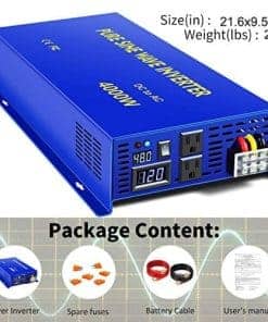 XYZINVT inversor de potencia de onda sinusoidal pura p Diseñado como un generador de energía portátil para alimentar múltiples elementos para viajes en automóvil y uso doméstico. Como respaldo, es ideal para emergencias por cortes de energía. ¡Siempre puede generar la energía cuando y donde la necesite /b br br b Características /b br br 1. Baja interferencia – Ofrece una energía de onda sinusoidal pura ultra limpia que es igual a la energía de la red de CA suministrada por su compañía de servicios públicos. Mejora el rendimiento del equipo de CA con tecnología de baja interferencia, buena elección para televisores, estéreos, etc. Ideal para cargas sensibles como instrumentos con alta precisión. br 2. Bajo consumo de energía en reposo – reduce la pérdida del circuito y mejora la eficiencia de los electrodomésticos eléctricos. br 3. Aplicación fuera de la red – Ideal para uso de emergencia siempre que tenga su batería completamente cargada. Puede generar su propia electricidad para su casa donde haya un corte de energía o apagón. br 4. Dos tomas de CA de EE. UU. y pantalla digital LED: alimente diferentes dispositivos al mismo tiempo sin problemas y monitoree los cambios de voltaje en cualquier momento. br 5. Operación fácil – Se puede mover fácilmente a diferentes unidades con conexiones rápidas. Se puede utilizar en el sistema solar y eólico también. Cargue su batería con panel solar con el controlador de carga solar. simplemente enchufar y listo. br br b Especificaciones /b br br Entrada de CC: 48V br Rango de entrada de CC: 42V-60V br Consumo de corriente en vacío: 1.5A br Eficiencia: 85% -90% br Voltaje de salida de CA: 120V br Regulación de CA: 3% br Frecuencia: 60Hz br Zócalo: tipo EUA br Alarma de voltaje bajo: 43V-45V br Apagado por voltaje bajo: 41V-43V br br b CONTENIDO DEL PAQUETE: /b br 1x Inversor de potencia de 4000W, 2x juegos de cables de batería, 1x interruptor remoto, 1 x manual del usuario, varios fusibles, nuestra garantía de 12 meses y servicio al cliente al 100%.