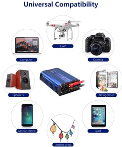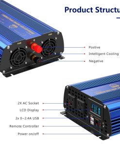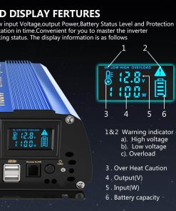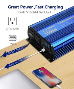 Inversor de potencia de 1100 vatios de onda sinusoidal modificada que convierte DC 12 voltios a AC 120 voltios. Proporciona una potencia continua del 100% de 1100 vatios, con 2 salidas de CA y 2 puertos USB de 2.4A, con pantalla LCD inteligente y control remoto. Garantía de 18 meses y seguro de responsabilidad del producto cubierto por AIG. Control remoto con pantalla LCD inteligente que muestra la entrada, salida de voltaje, capacidad de la batería e indicación de protección. Más ampliamente utilizado con 2 salidas de CA y puerto USB de DC 5V 2.4A 2, adecuado para la mayoría de los dispositivos USB y dispositivos más grandes como electrodomésticos y herramientas eléctricas. Protección avanzada contra sobretensión, baja tensión, sobrecarga, cortocircuito y sobrecalentamiento. Carcasa de aluminio duradera con ventilador de enfriamiento incorporado para garantizar un funcionamiento seguro y efectivo a baja temperatura. Incluye un inversor de potencia de onda sinusoidal modificada de 1100 W, un controlador remoto RJ10 de 15 pies, un manual de instrucciones y un par de cables de batería. Servicio al cliente amigable y paciente. Garantía de 18 meses.