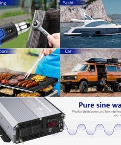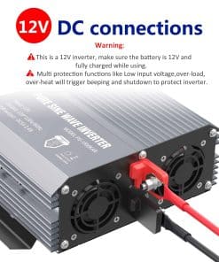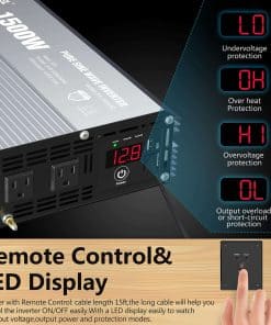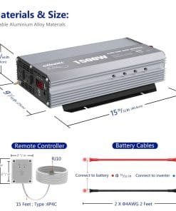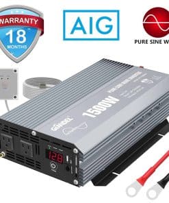 GIANDEL, una marca líder de inversores de potencia en Estados Unidos, Australia, Europa. GIANDEL ha estado dedicada a resolver tus problemas de energía en actividades al aire libre, emergencias, durante más de 20 años. Ideal para Camiones, RV en viajes por carretera o en caso de cortes de energía, alimenta tus dispositivos en casa o al aire libre en caso de Emergencia, Huracán, Tormenta, Corte de energía. ESPECIFICACIONES: Potencia: potencia nominal de 1500 vatios, potencia pico de 3000 vatios. Onda de salida: Onda sinusoidal pura. Voltaje de entrada: 9.8-16VDC. Voltaje de salida: 120 Vac 10%. Eficiencia: hasta 90%. Pantalla LED: para observar el voltaje de entrada, Potencia de cargas, modos de protección, etc. Controlador remoto con cables de 15 pies. Ventilador de refrigeración inteligente incorporado: funcionará automáticamente cuando la temperatura alcance los 104 grados Fahrenheit o la potencia de carga sea superior al 40% de la potencia nominal. Protección contra sobrecalentamiento: alrededor de 149 grados Fahrenheit. Apagado por sobretensión: 16V 0.5VDC. Alarma de subvoltaje: 9.8V 0.5VDC. Apagado por subvoltaje: 9.5V 0.5VDC. ATENCIÓN: Conecte el inversor a una batería de 12V con los cables estándar proporcionados con el producto, y conecte sus dispositivos AC al inversor. Por favor, no deje el inversor en la posición ON mientras su automóvil esté apagado. Desconecte el terminal positivo de la batería antes de realizar cualquier cableado al inversor. No exponga el inversor directamente al sol, manténgalo en un ambiente fresco y seco. No use el inversor con un producto que requiera más vatios de los que el inversor puede proporcionar, ya que esto podría dañar el inversor y el producto. LISTA DE PAQUETES: 1x Inversor de Potencia de 1500 vatios. 2x Cables de batería (negro y rojo). 1x Control Remoto. 1x Manual del usuario. GARANTÍA: 18 meses de garantía por GIANDEL.