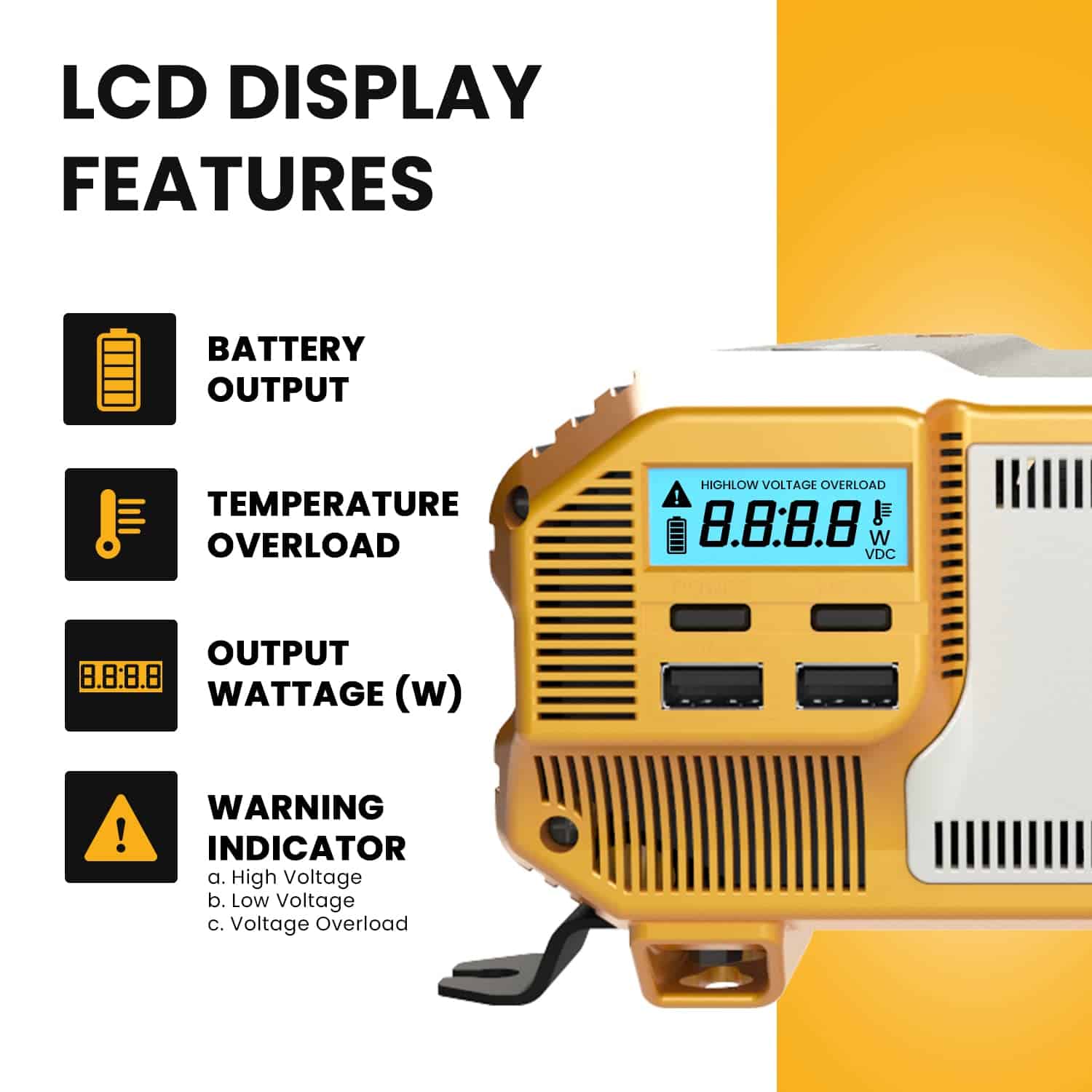 Tenemos tu respaldo – Este inversor tiene todas las protecciones que necesitarás, Sobrecarga, Temperatura, cortocircuito y todas estas protecciones se mostrarán en el LCD frontal – ¡Nuevamente Metlab ha probado y validado todas estas funciones de protección!