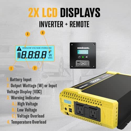 Potencia continua de onda sinusoidal pura de 1500 vatios, potencia máxima de 3000 vatios, inversor de potencia KP1500 de onda sinusoidal pura convierte 12V de CC a 120V de CA, conecte los cables de la batería de CC directamente a su batería de 12V y tendrá energía sobre la marcha. Perfecto para una Emergencia, Huracán, Tormenta o Apagón – Nuestra versión de todo incluido! control remoto LCD con cable, kit de fusible ANL en línea y cables de batería de 3 pies incluidos. ¡Te tenemos cubierto! Este inversor tiene todas las protecciones que necesitará. Sobrecarga, sobretensión, subtensión, alta temperatura y cortocircuito. Todo esto se muestra en la pantalla LCD, así como el voltaje de entrada, la potencia de salida y el nivel de la batería. ¡No solo tomamos nuestra palabra para la clasificación de este inversor, este artículo ha sido probado, validado y aprobado por Intertek tanto por su seguridad como por su rendimiento! Aprobado por ETL bajo el estándar UL 458 y CSA std C22.2 ¡No puedes equivocarte con Krieger! Creemos en nuestro producto y calidad y ofrecemos la garantía que lo demuestra 3 años de garantía de piezas y mano de obra.