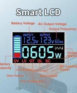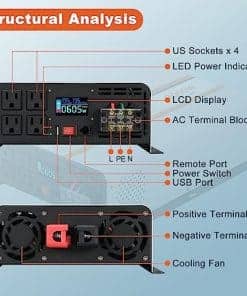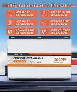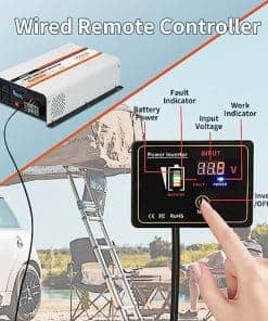 Inversor de onda sinusoidal pura de 3000 vatios de OUBOTEK, convierte la corriente continua de 12V a la corriente alterna de 120V con alta eficiencia. La pantalla LCD profesional muestra información vital como el voltaje de la batería, voltaje de salida, frecuencia, forma de onda de salida, potencia de carga y el estado de protección para brindar una capa adicional de protección. Viene con un control remoto con cable para mayor comodidad, con botón de ENCENDIDO/APAGADO y visualización de la potencia de la batería, voltaje de entrada y estado de funcionamiento. Diseñado con tecnología avanzada de seguridad que protege contra múltiples condiciones como bajo voltaje, sobre voltaje, sobrecarga, cortocircuito y sobre temperatura. Los ventiladores de enfriamiento se activan automáticamente para mantener la temperatura interna baja y mantener el inversor limpio. Con 4 tomas de corriente alterna, 1 bloque terminal de CA y 1 puerto USB, este inversor es perfecto para alimentar una variedad de dispositivos electrónicos en caravanas, barcos, campamentos, sistemas solares y uso doméstico. El paquete incluye todos los cables necesarios, fusibles de repuesto, herramientas y un manual de usuario para una instalación fácil y rápida.