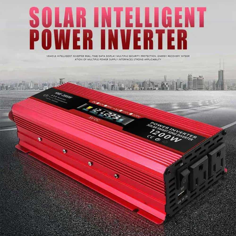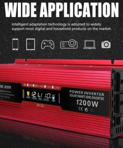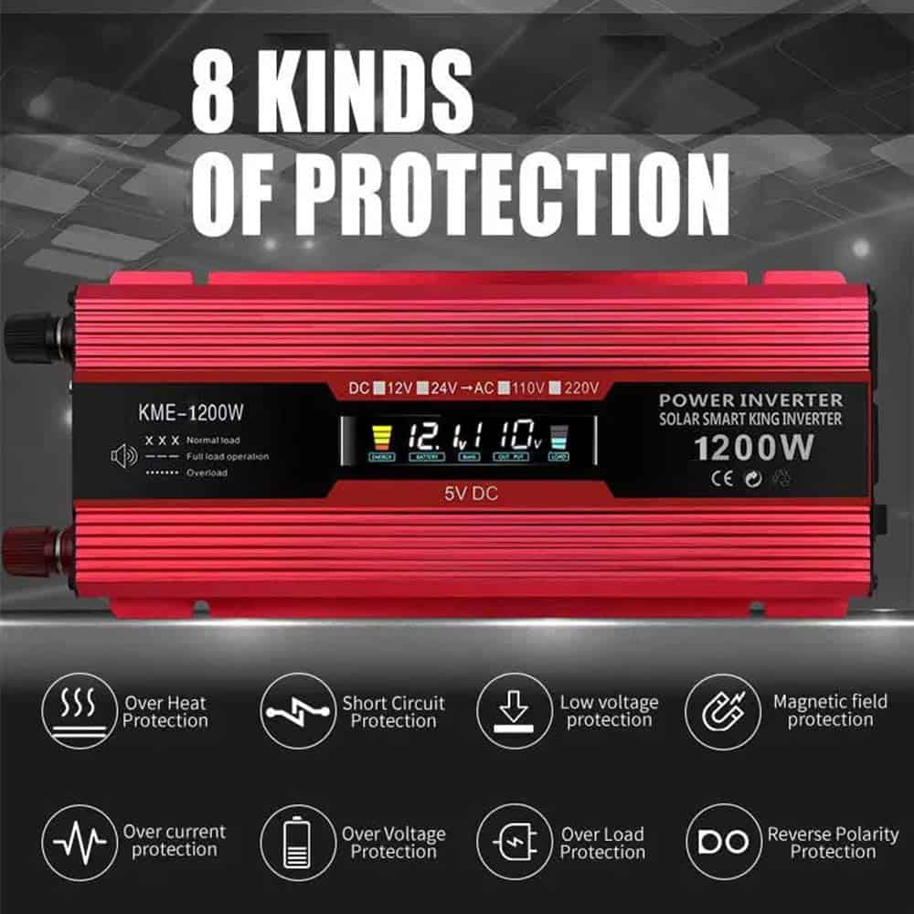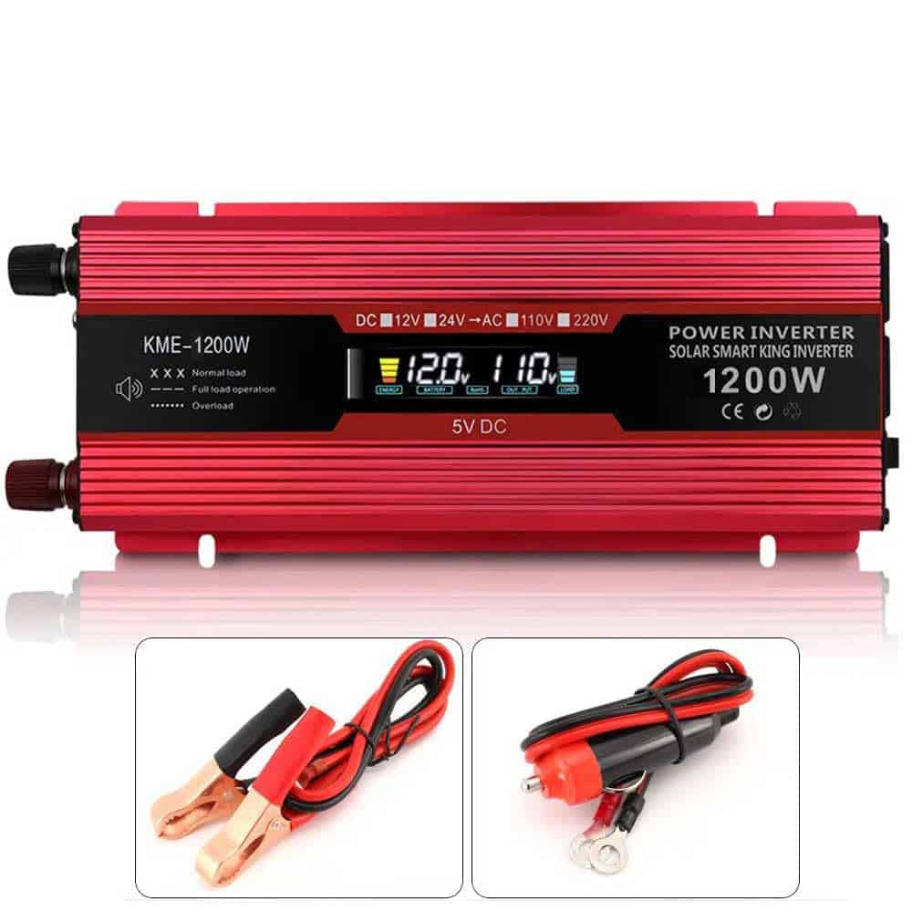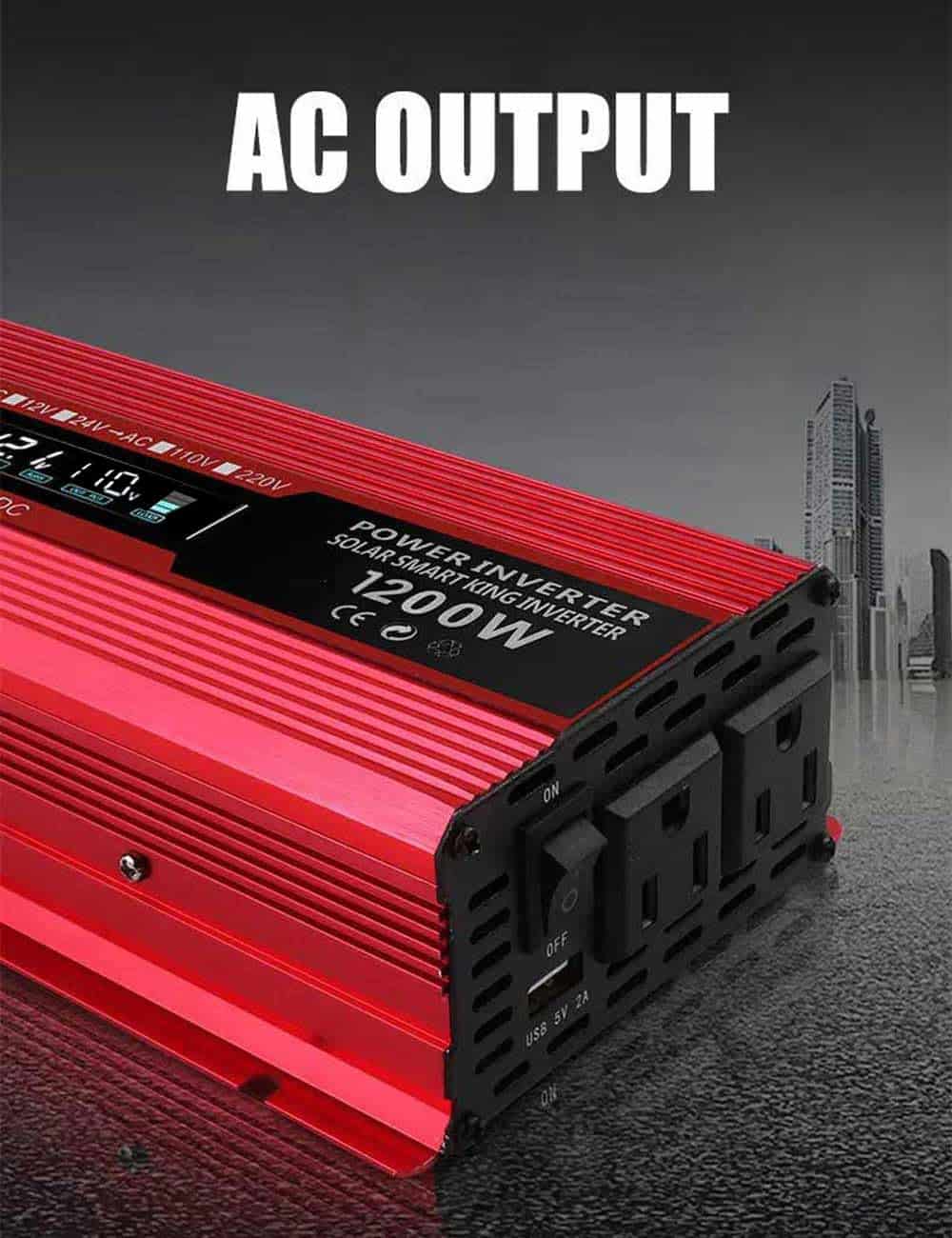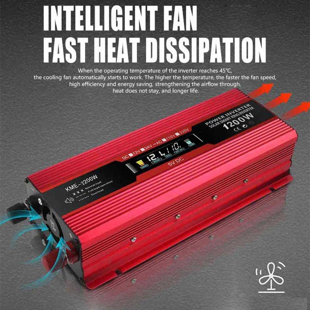 1. 1200 Watts de potencia máxima: convierte la energía de la batería de 12V DC en 110V AC estándar, proporciona 600 Watts de potencia continua de onda sinusoidal modificada y 1200 Watts de potencia máxima. Con 2 salidas de CA y puertos USB. Alta tasa de conversión, eficiencia de conversión del 90%.
