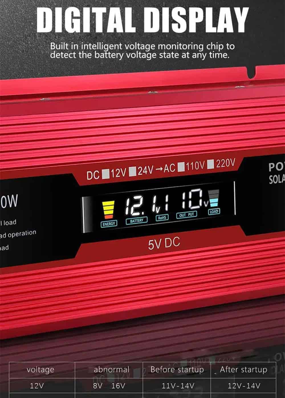 2. Pantalla LCD inteligente actualizada: Cuando el inversor está funcionando normalmente, la pantalla LED mostrará el voltaje de entrada/salida, la capacidad de la batería/carga. Fácil de conocer la capacidad de carga.