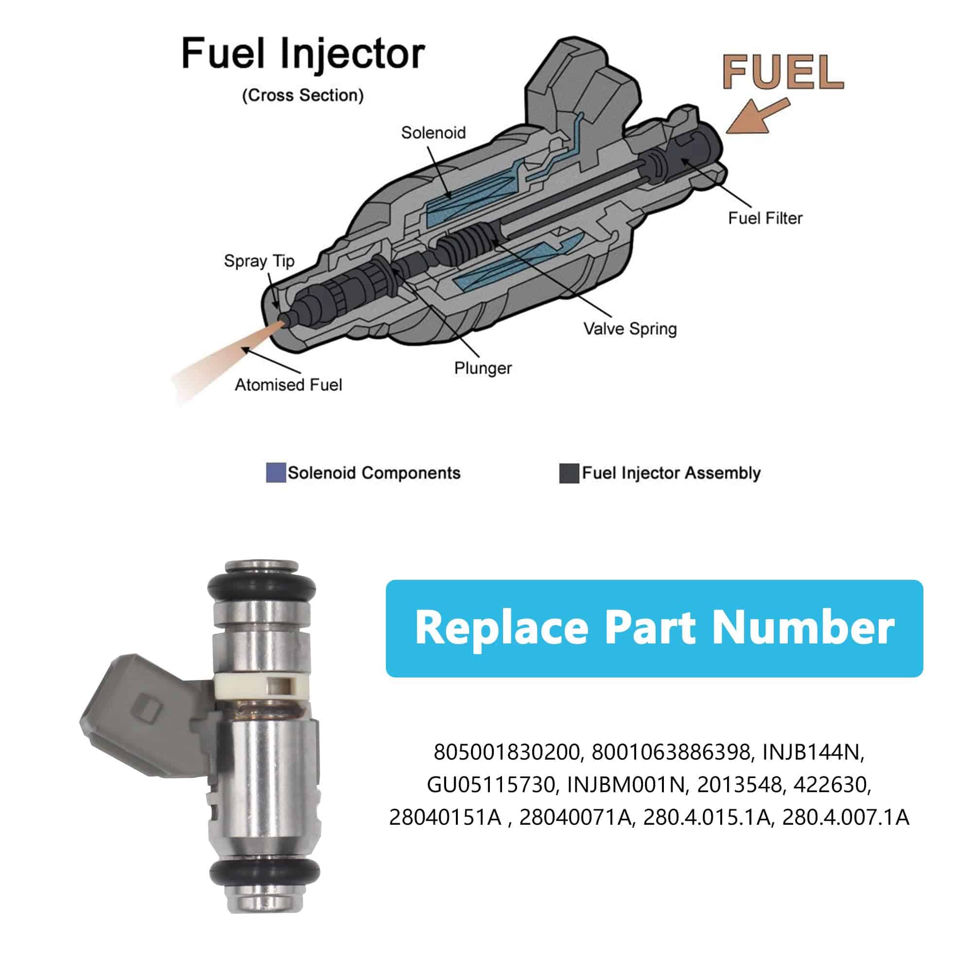 4. Función: El inyector de combustible transfiere gasolina del tanque a los cilindros del motor para proporcionar potencia al vehículo. La gasolina entra en los inyectores de combustible en forma líquida y la transforma en neblina para pulverizarla en el cilindro para una quema de combustible eficiente y rápida.